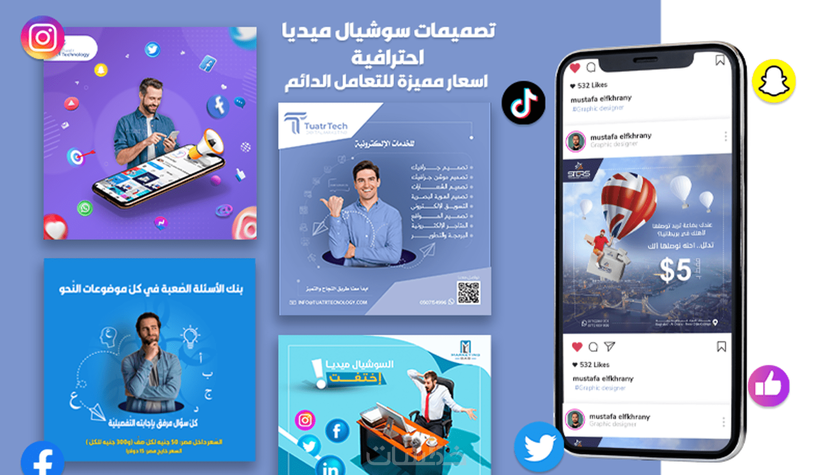 اقوم بعمل جميع تصميمات السوشيال ميديا على جميع المنصات ( فيس بوك - تويتر - انستجرام _سناب)