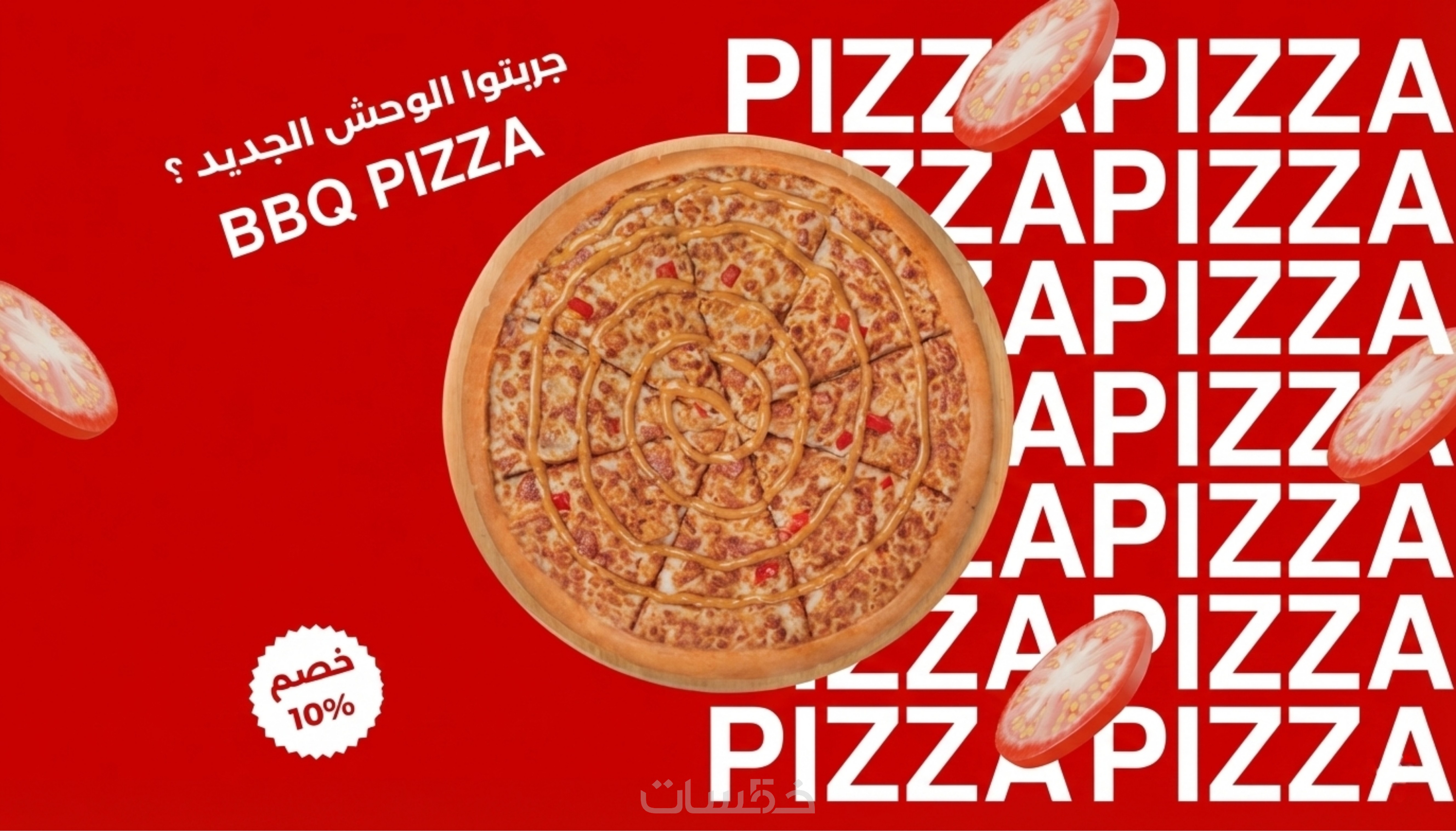 تصميم بوست إعلاني لمطعم بيتزا. يتميز باللون الأحمر الجاذب للشهية، مع استخدام نصوص عريضة واحترافية تبرز اسم المنتج، بالإضافة إلى إضافة عرض خصم 10% بشكل بارز لتحفيز العملاء على الشراء