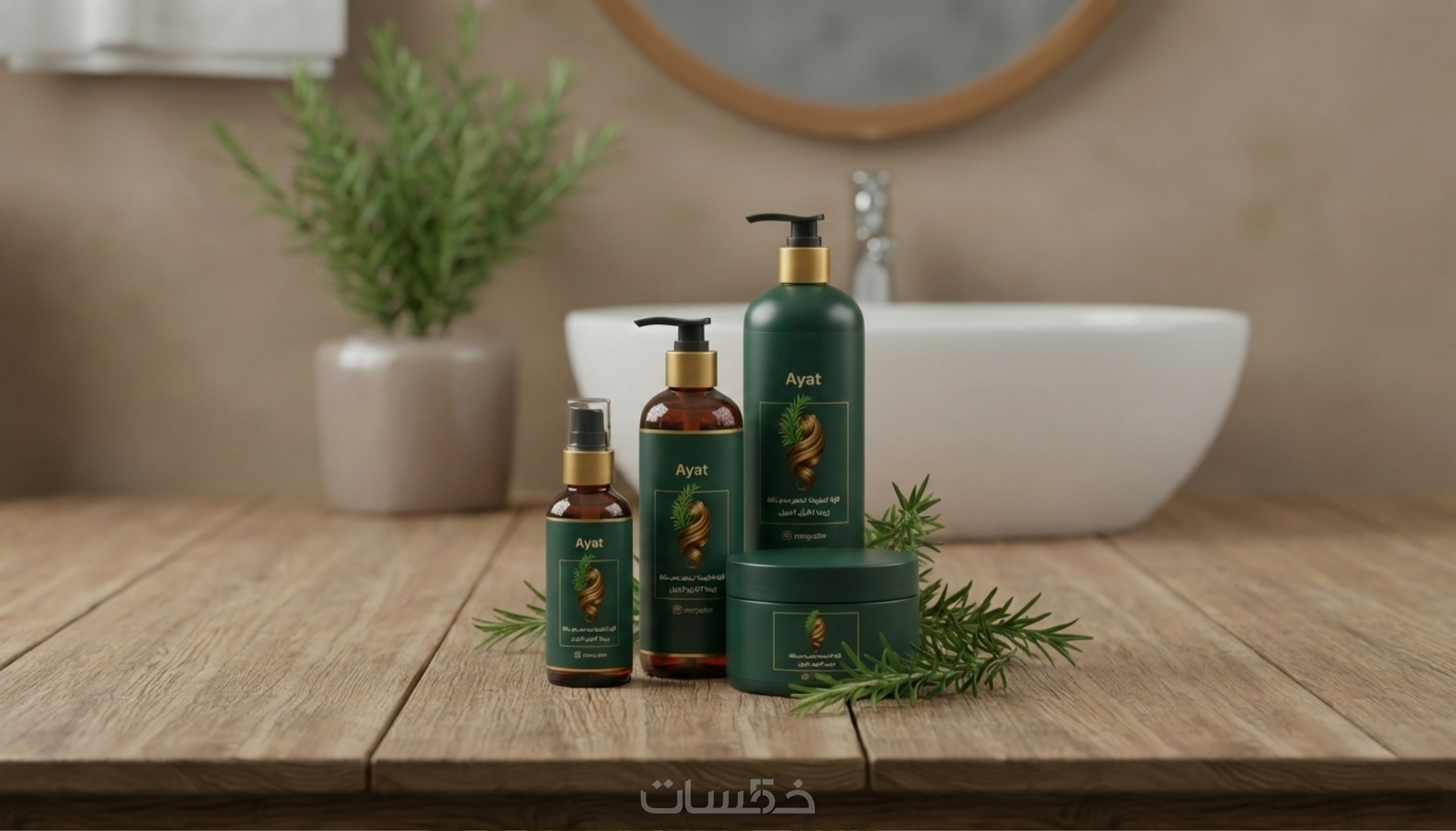 تصميم إعلاني لمنتجات العناية بالشعر (براند آيات) ليبل للمنتجات. يعتمد التصميم على الألوان الطبيعية والهادئة التي تعكس جودة المنتج، مع دمج العناصر في بيئة واقعية (Mockup) تعطي انطباعاً بالفخامة والاحترافية