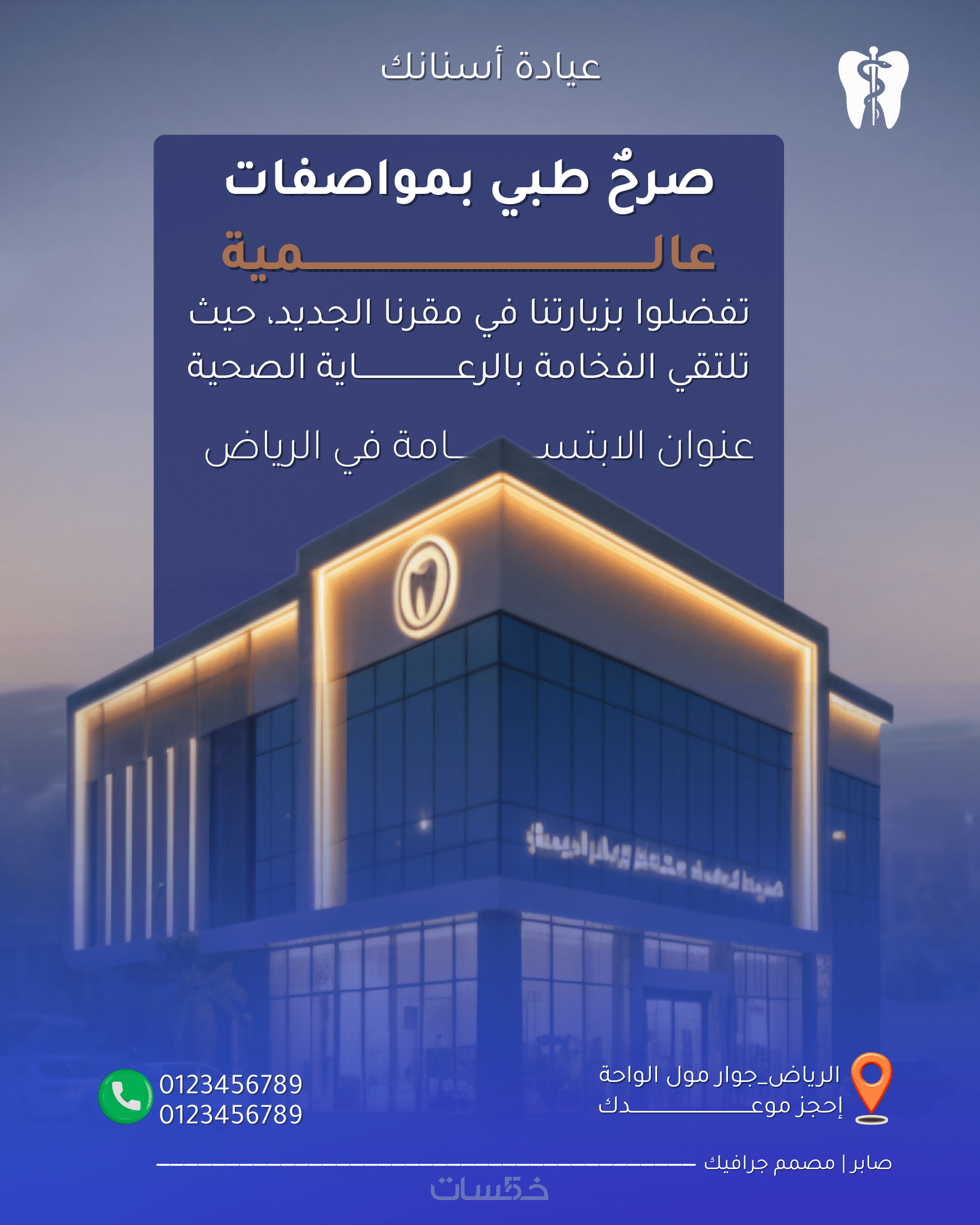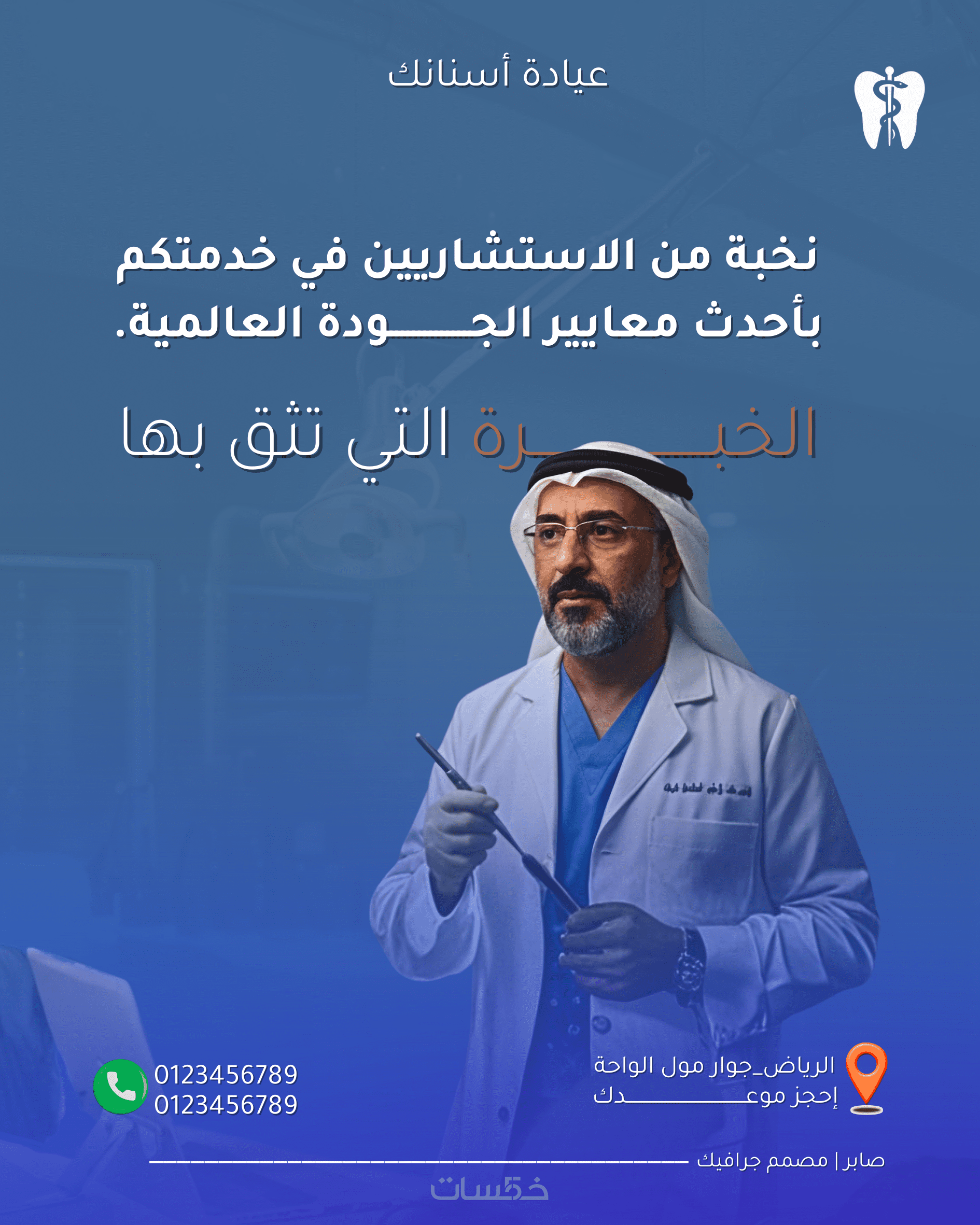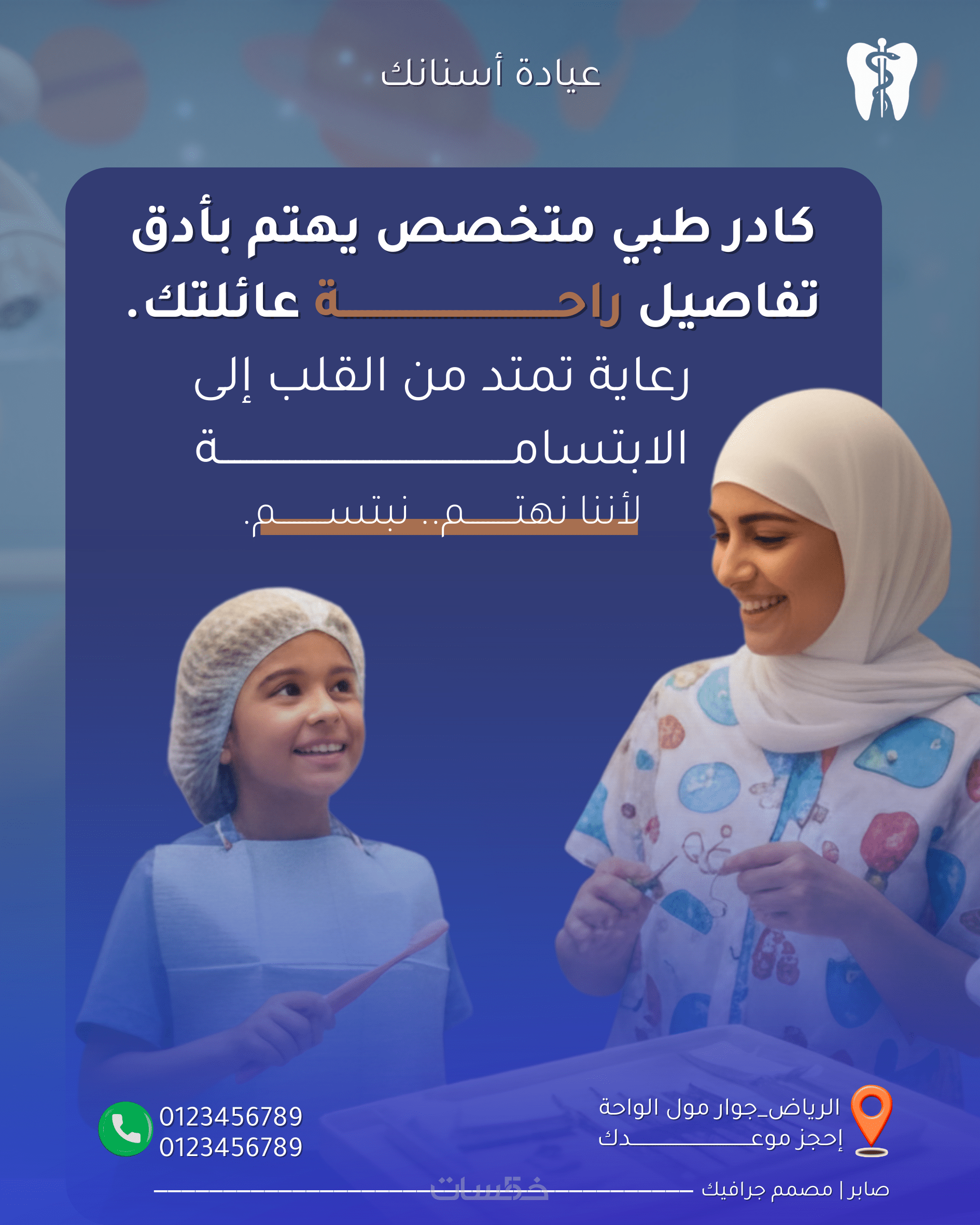 أقدم لك خدمة تصميم منشورات السوشيال ميديا المتخصصة للمجال الطبي (عيادات الأسنان خصوصاً)، بأسلوب يجمع بين الجاذبية البصرية والمصداقية الطبية.