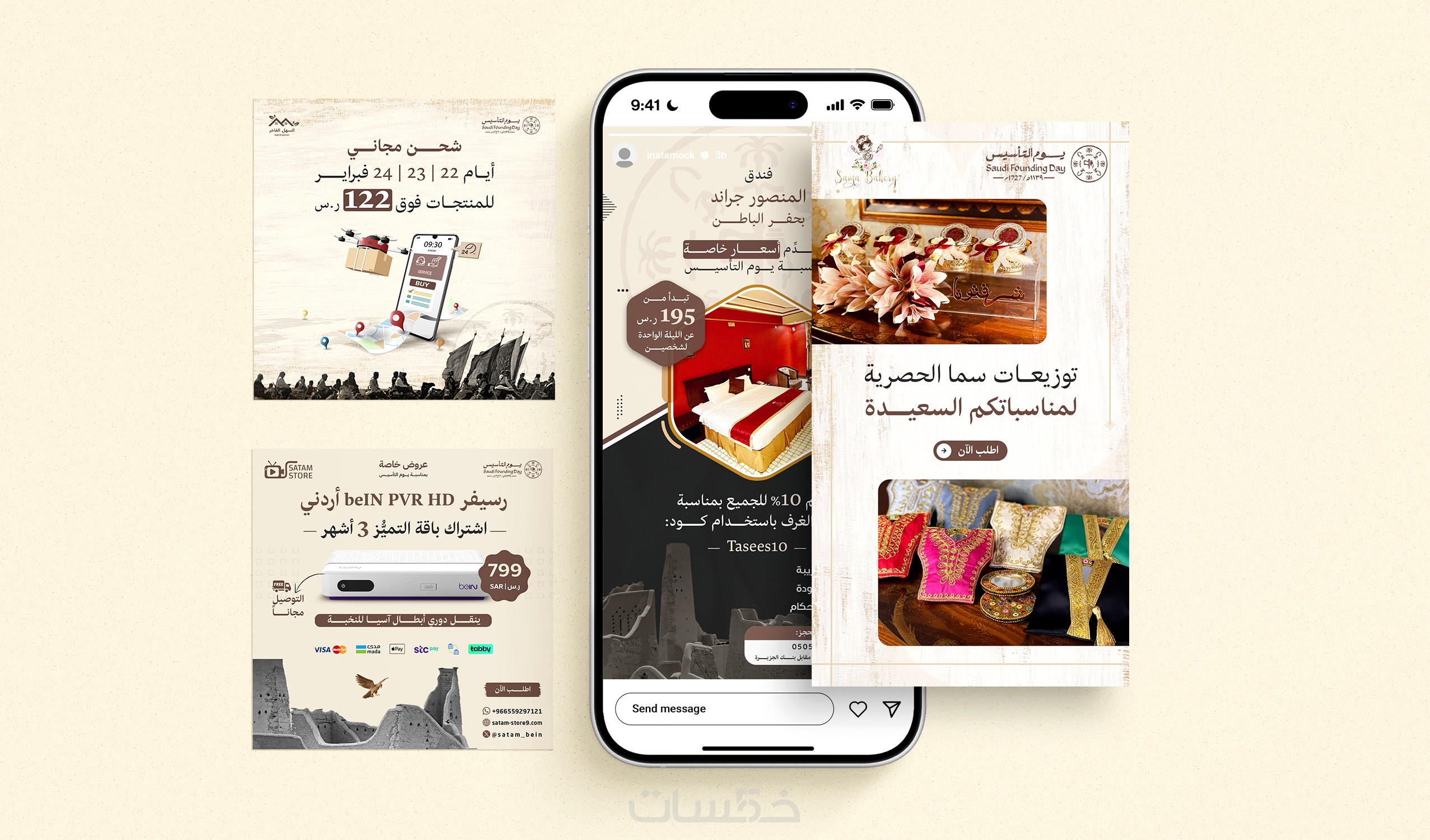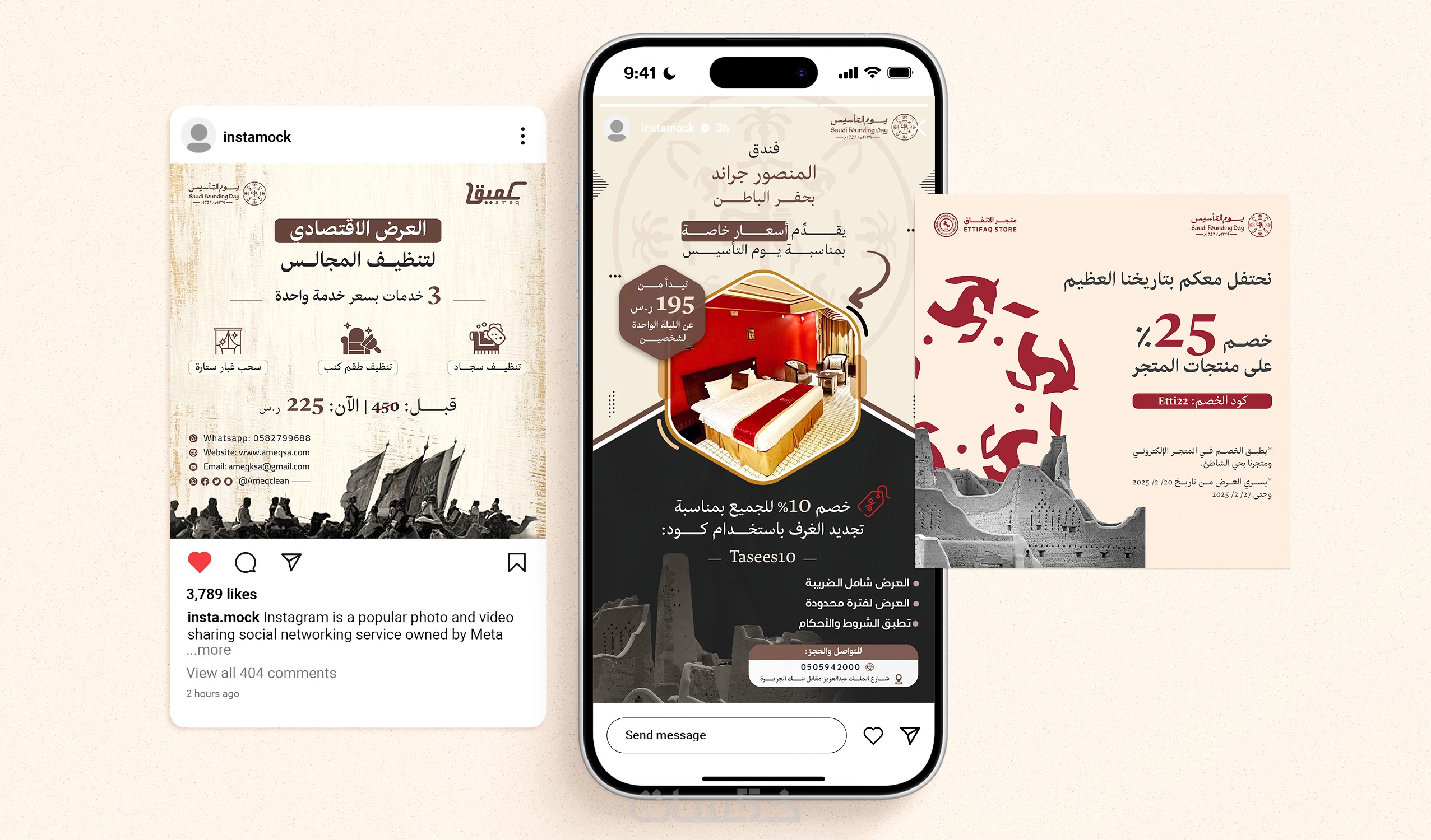 احتفِل بفخرٍ بمناسبات الوطن المجيد عبر تصاميم مخصصة تَصْهُرُ فيها روحُ الهوية الوطنية بإبداع. نقدم لك تصاميم جذابة وعصرية تناسب يوم التأسيس، ويوم العلم، واليوم الوطني، وغيرها من المناسبات العزيزة، بمستوى احترافي يليق بالحدث، وجاهزة للنشر الرقمي والطباعة.