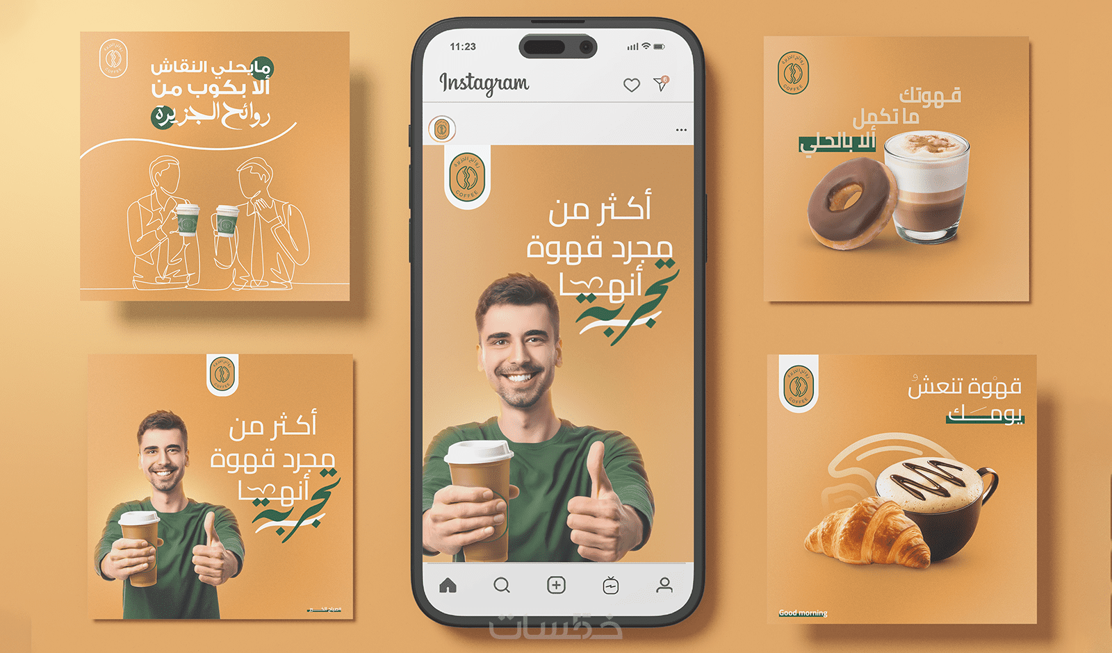 - يبدأ المصمم تصميم المنشور باختيار الصور المناسبة للتصميم وللعلامة التجارية، ثم وضعها في قالب مخصص ويكتب عليها العبارات المطلوبة.