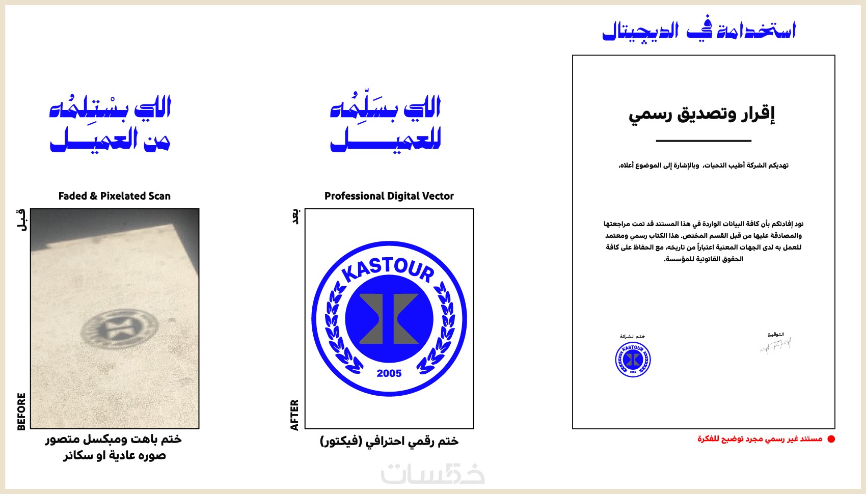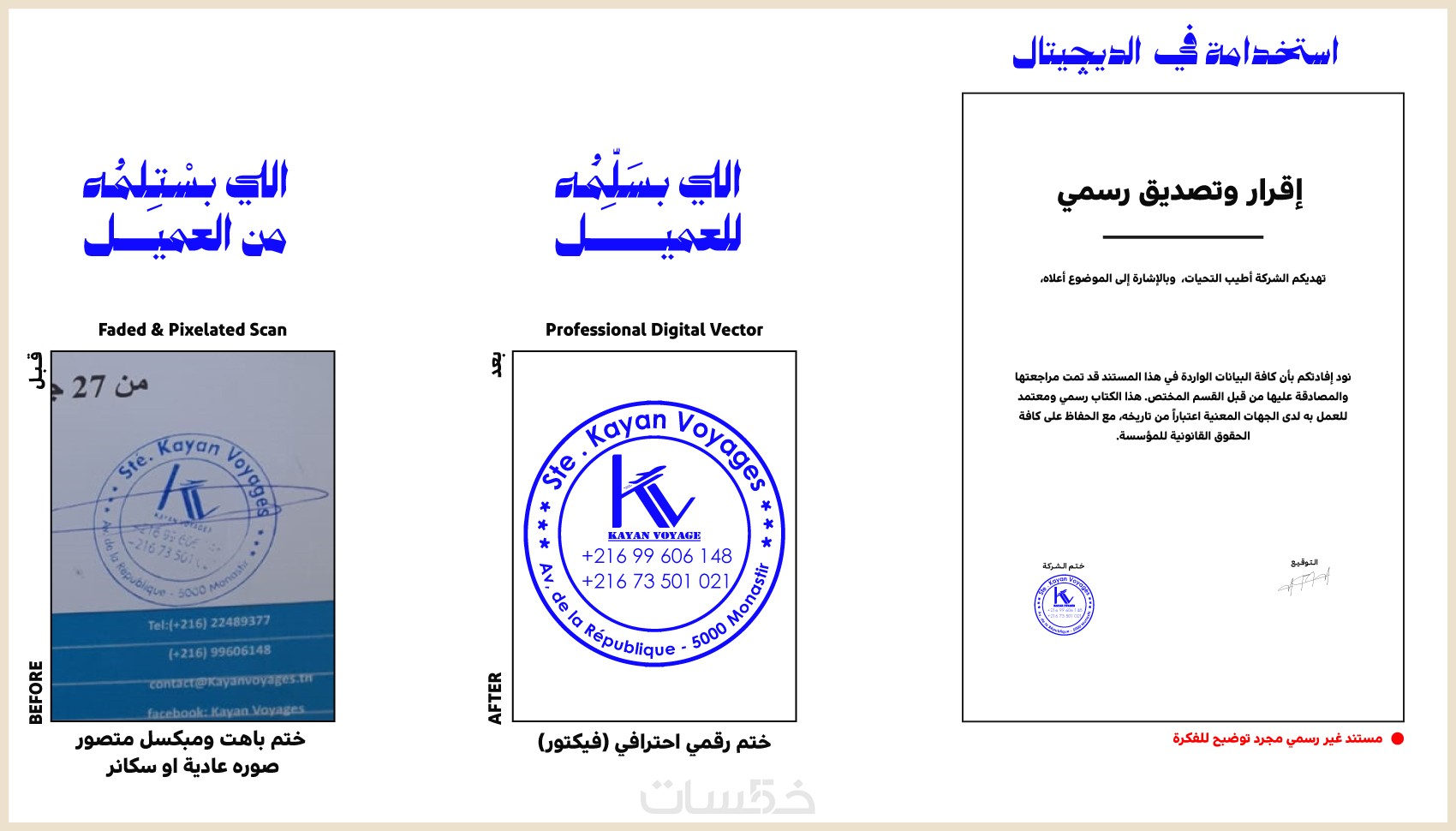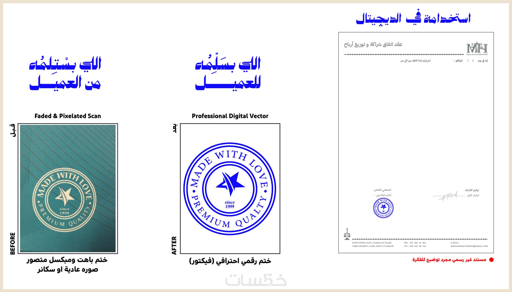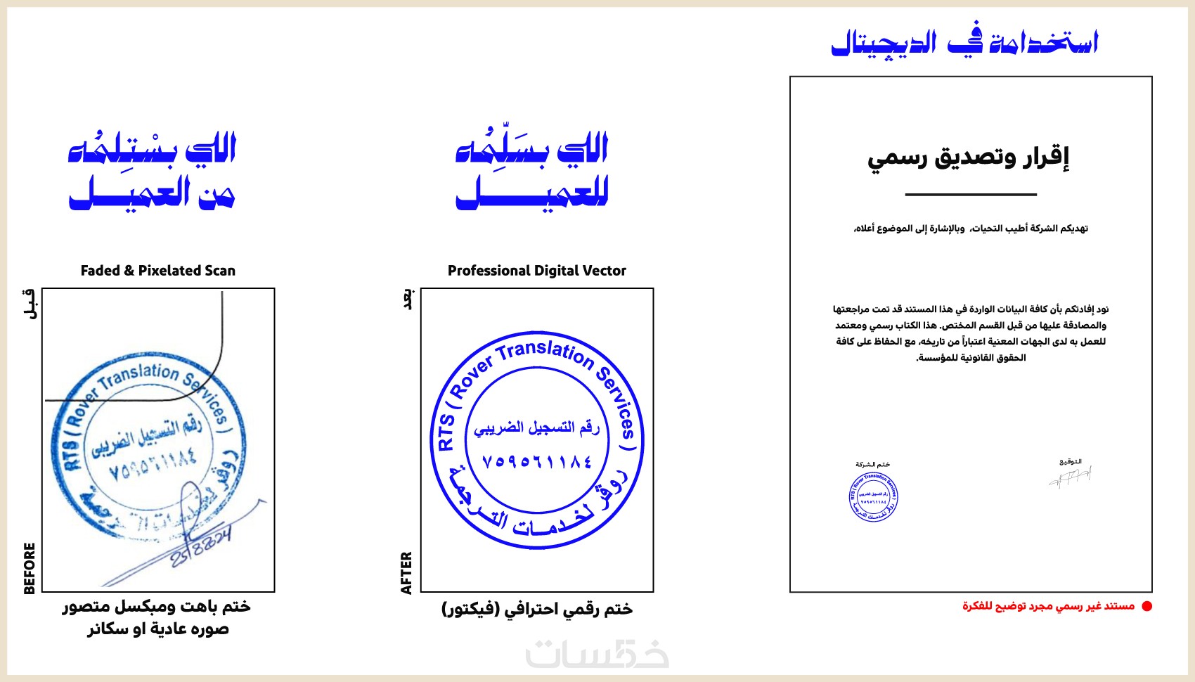 دقة متناهية: إعادة رسم الختم يدوياً لضمان تطابقه مع الأصل بنسبة 100%.