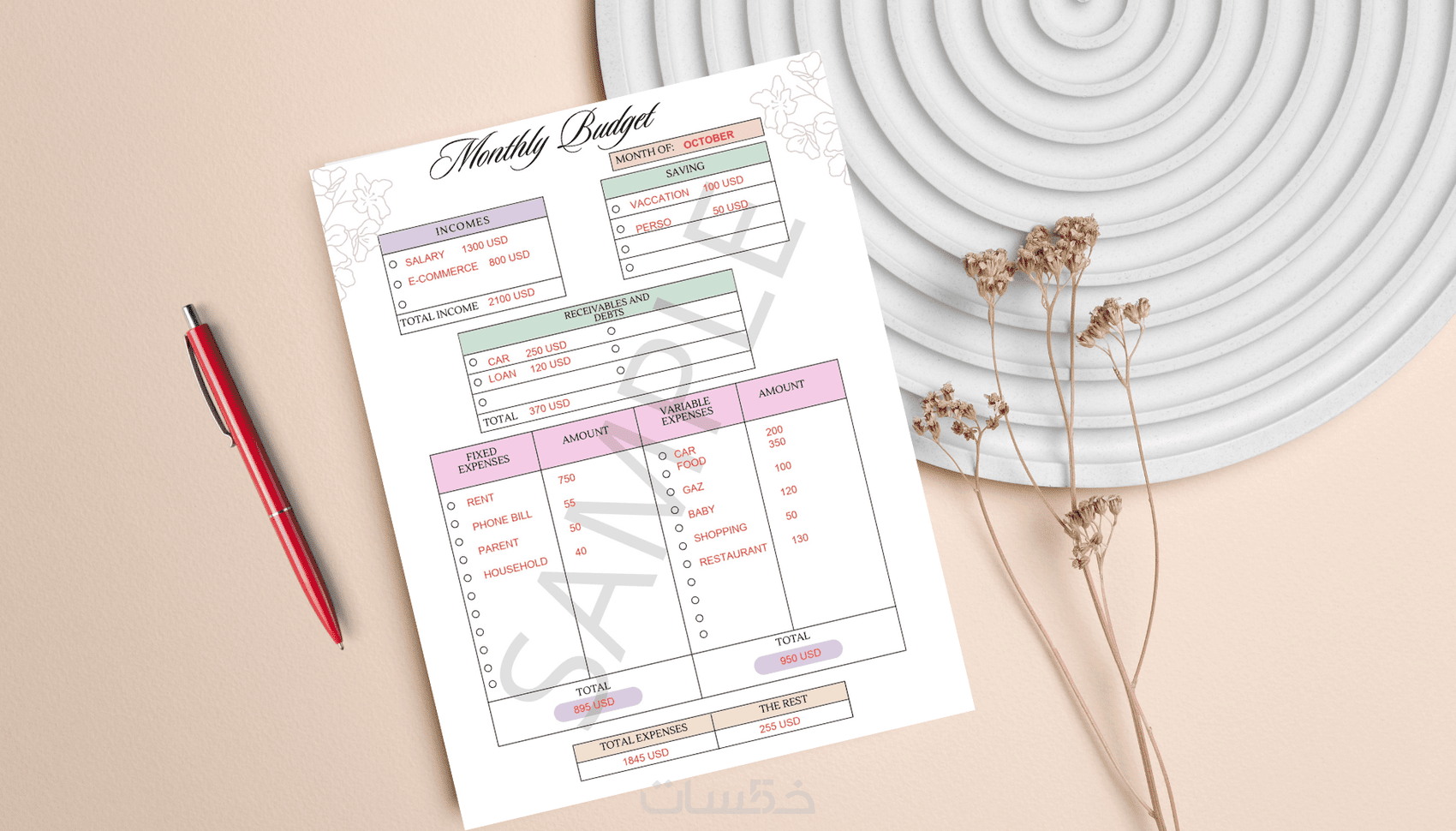 - تصميم الميزانية الشهرية للتتبع المصاريف و الأقساط.