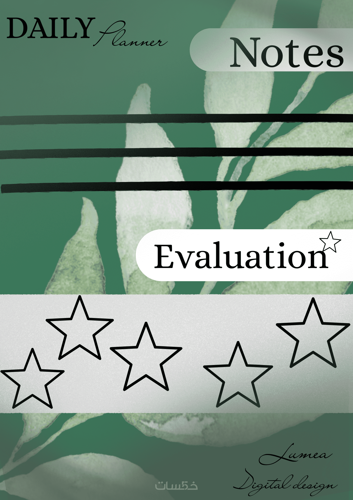 يشمل تخطيط يومي، صفحة مصروفات، صفحة ملاحظات وتقييم في نهاية البلانر.