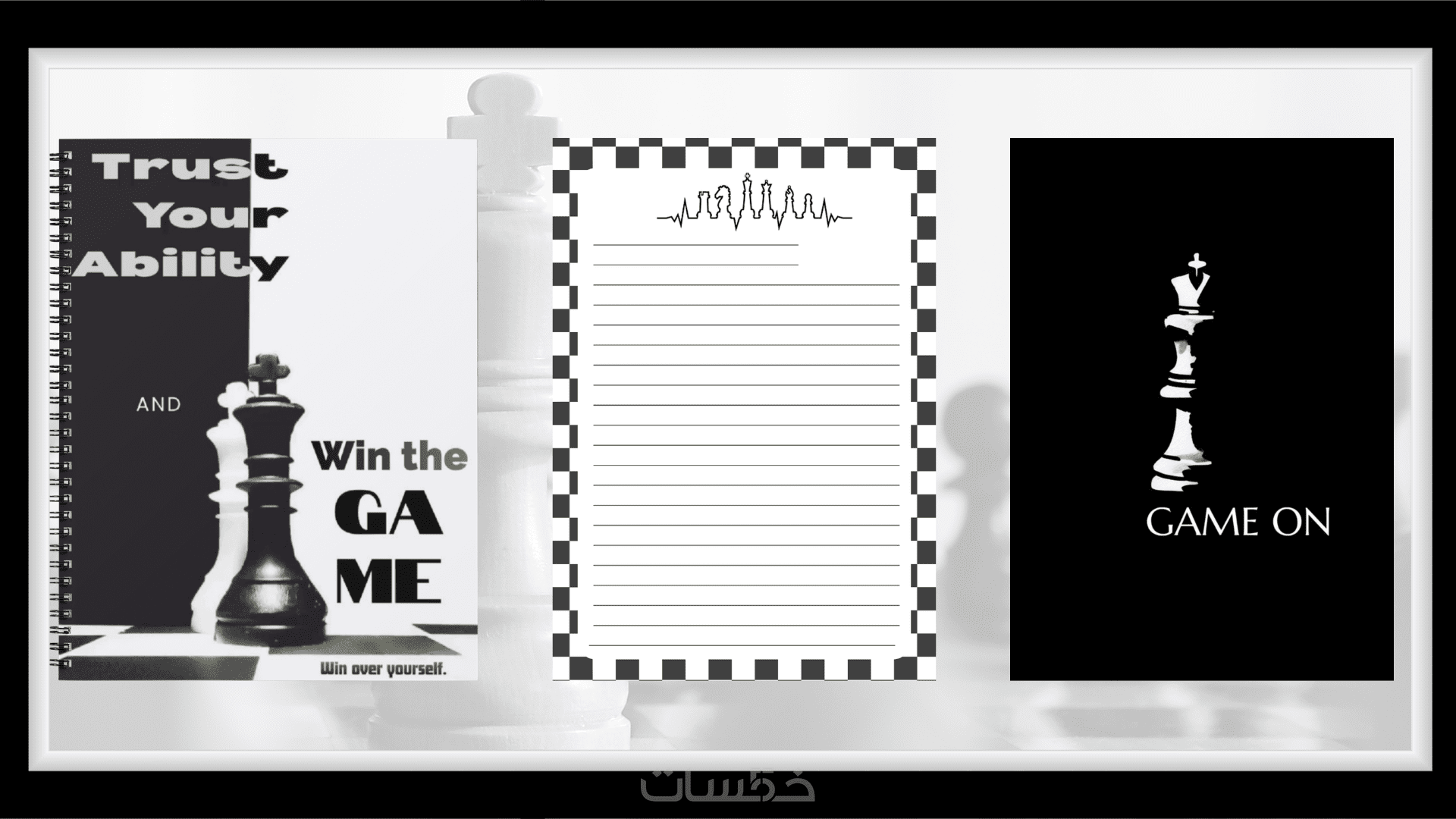 • دفاتر مخصصة بفكرة خاصة (مثلاً: Chess Notebook – Rap Lyrics Notebook – Minimal Notebook)