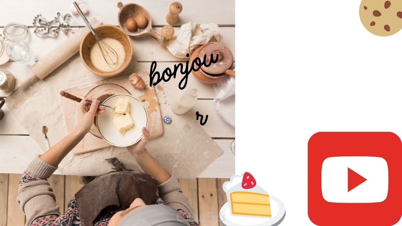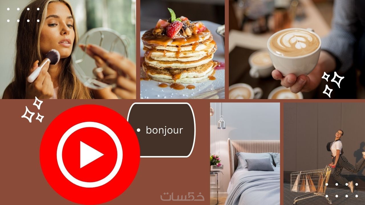 النص: عنوان جذاب بخط كبير وواضحbonjour مع تباين لوني قوي (مثل أبيض على خلفية البرتقالي والبني والابيض أو أصفر على خلفية )