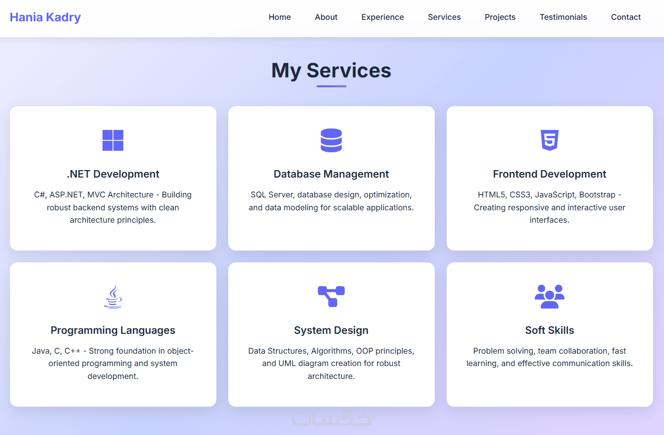 عنّي (About): للتعريف بالمصمم أو صاحب الموقع.