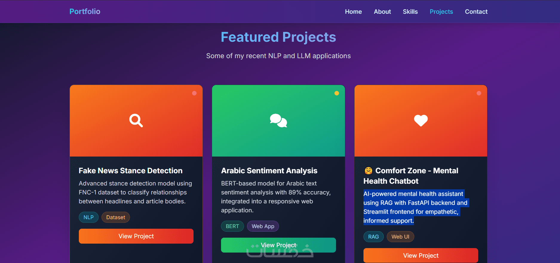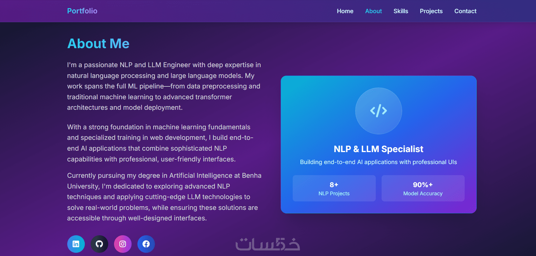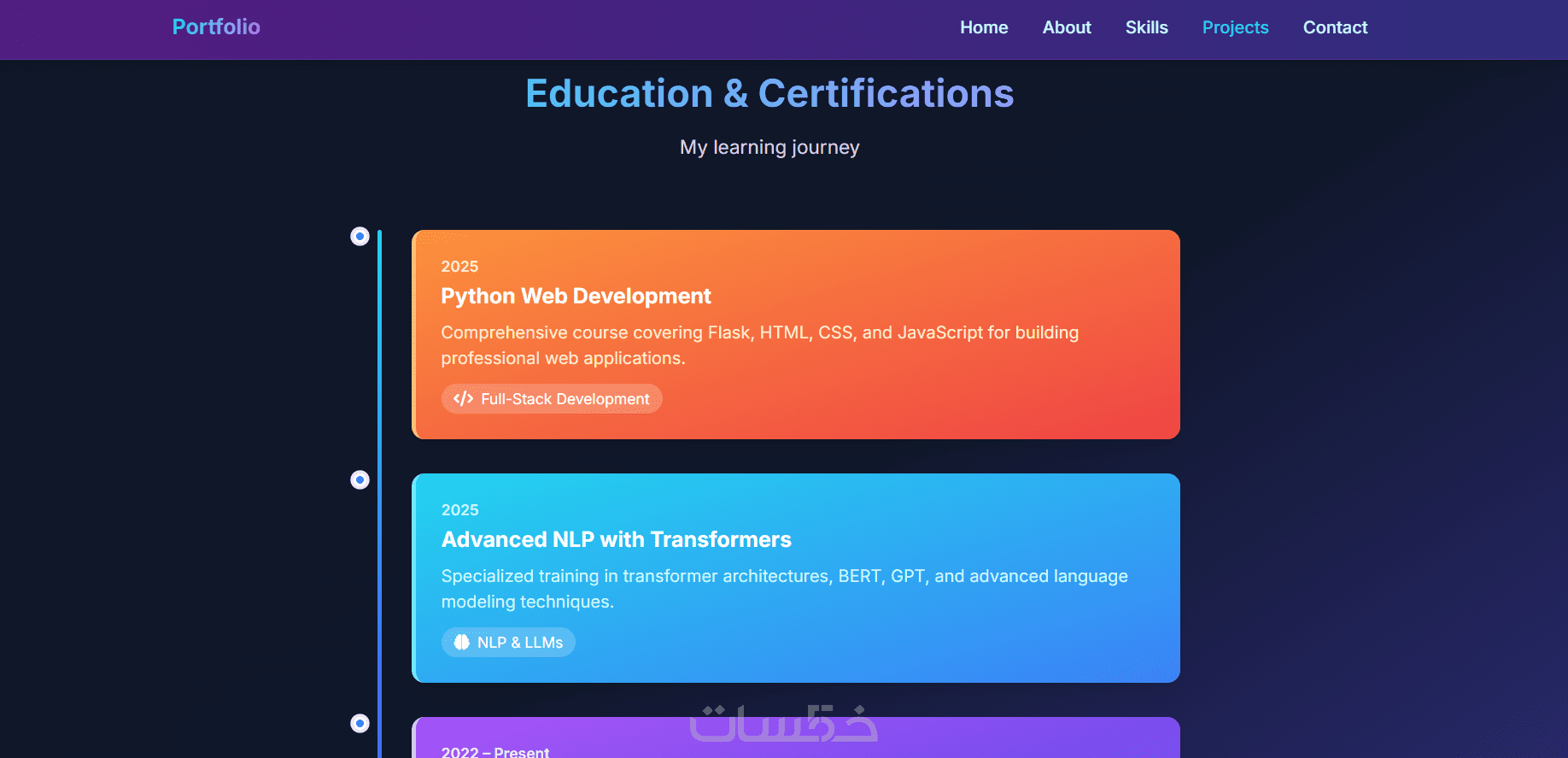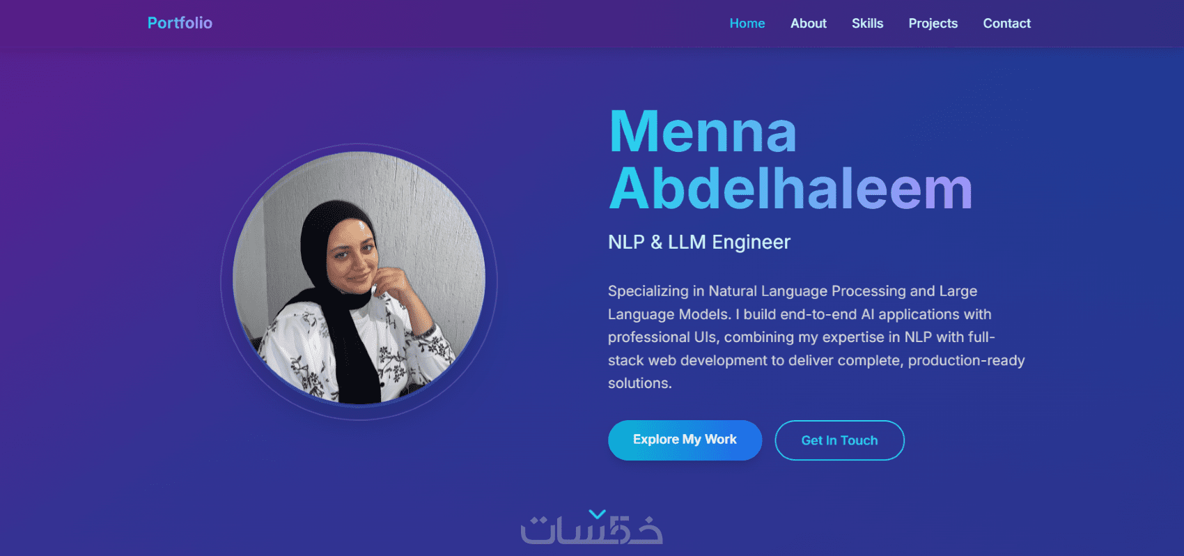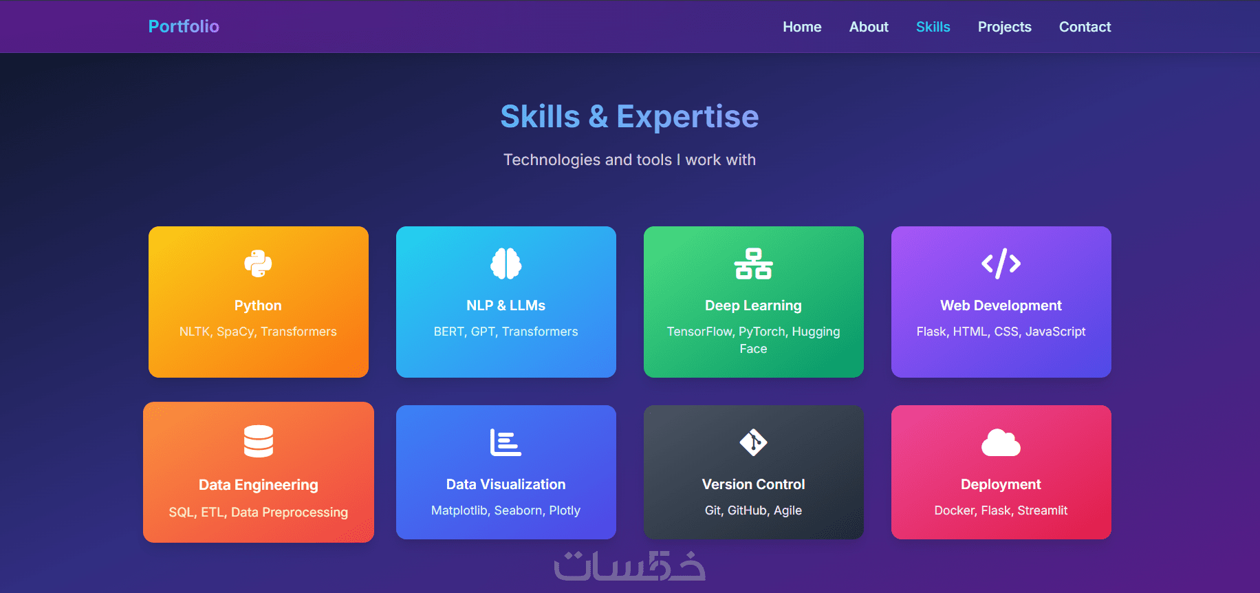 البورتفوليو سيكون عباره عن موقع ويب صفحة واحدة مكون من Home, About, Skills, Projects, Contact