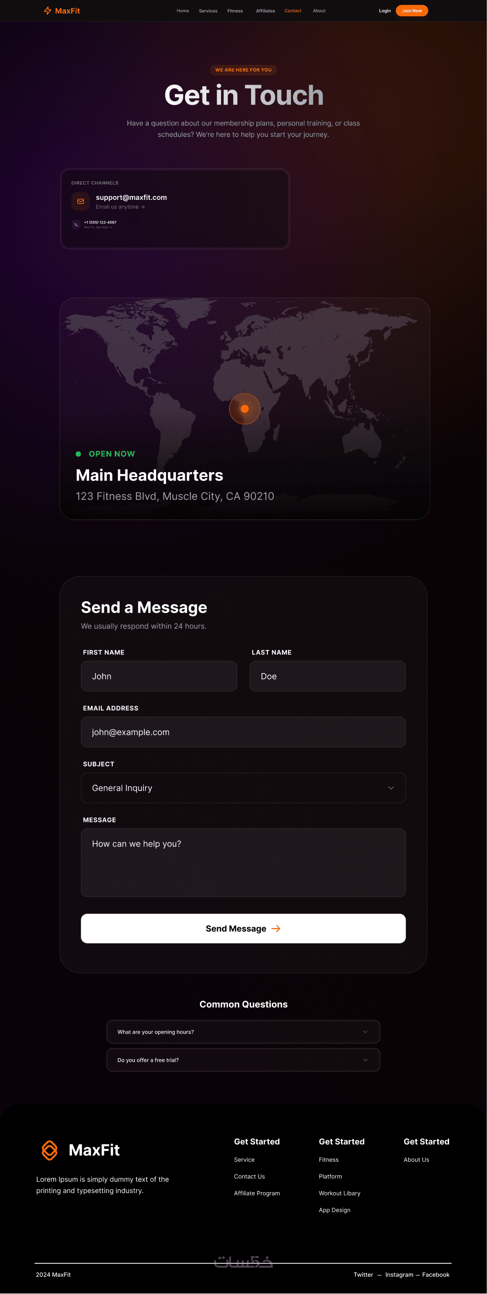 خريطة موقع تفاعلية + زر واتساب "عائم" يظهر دائماً أسفل الشاشة للتواصل السريع.