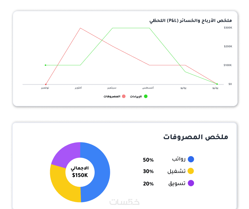 بطاقات الأداء: عرض فوري للأرقام الحيوية (الإيرادات، المشاريع النشطة، مصاريف الإعلانات).