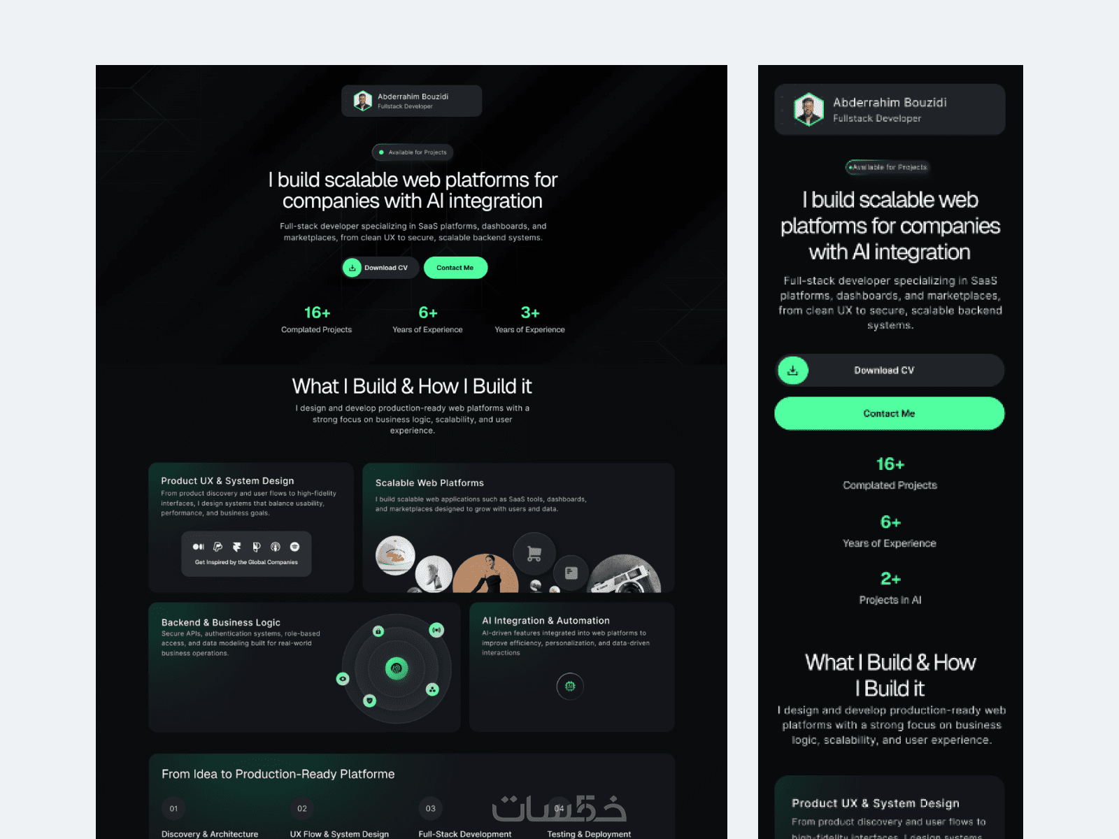 مرحبًا! أنا مصمم واجهات وتجربة مستخدم (UI/UX) متخصص في تصميم مواقع حديثة وعصرية. لدي خبرة في تصميم أكثر من 30 موقعًا، وأعمل دائمًا على تحويل أفكارك إلى واجهات جذابة وسهلة الاستخدام تلبي أهداف مشروعك.