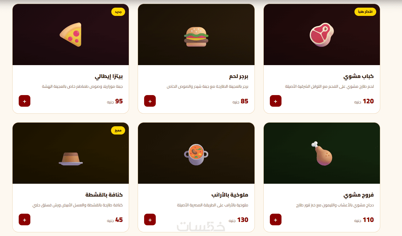3. قسم قائمة الطعام — عرض الأطباق مع فلتر (شرقية / غربية / حلويات) + الأسعار + زر الطلب