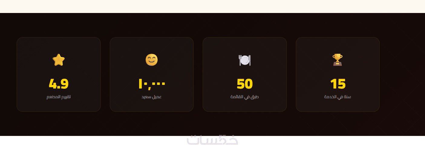 1. قسم الرئيسية (Hero) — عنوان رئيسي + وصف + أزرار تفاعلية + إحصائيات المطعم