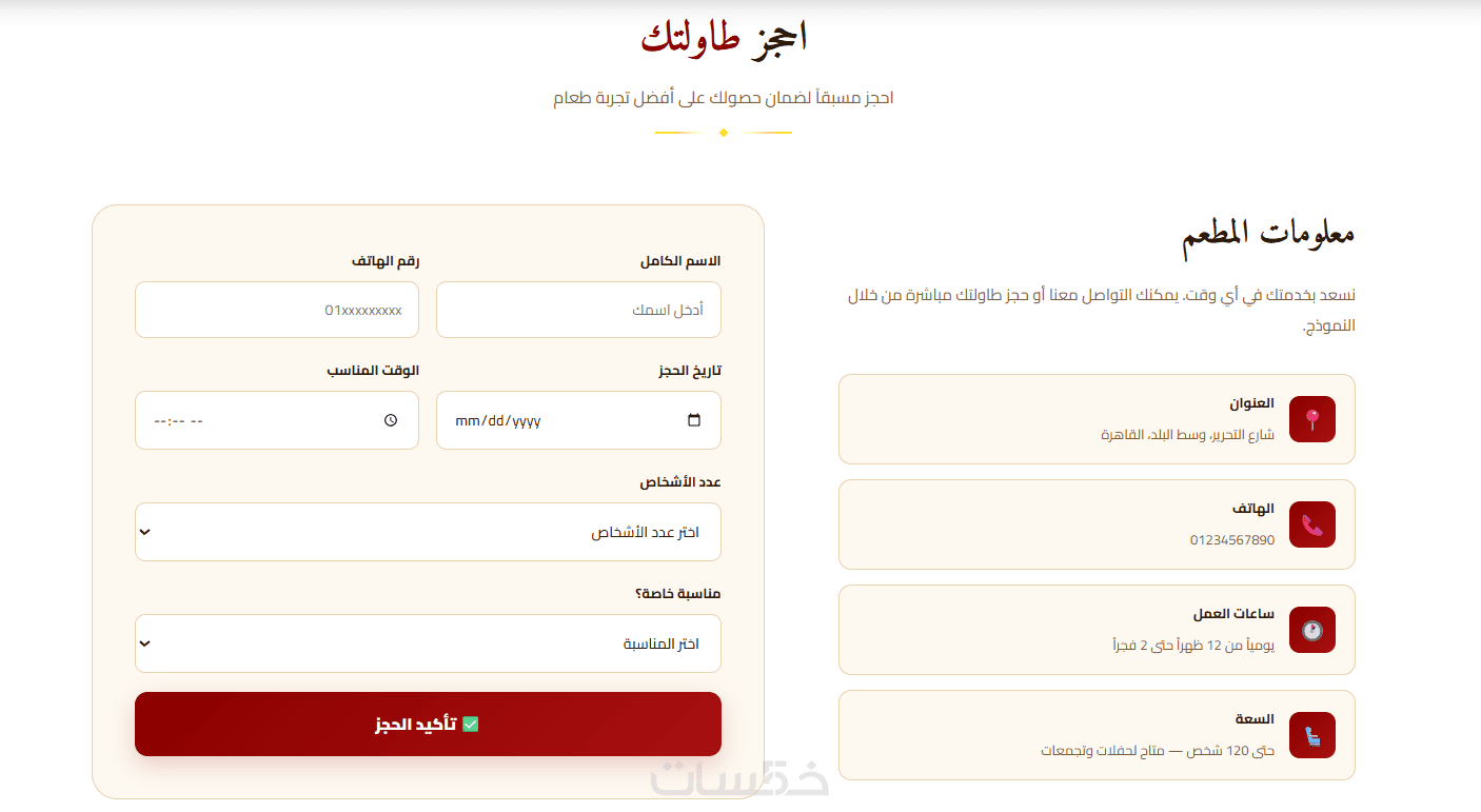 4. قسم الحجز — نموذج حجز الطاولة (الاسم، الهاتف، التاريخ، الوقت، عدد الأشخاص، المناسبة) + بيانات التواصل