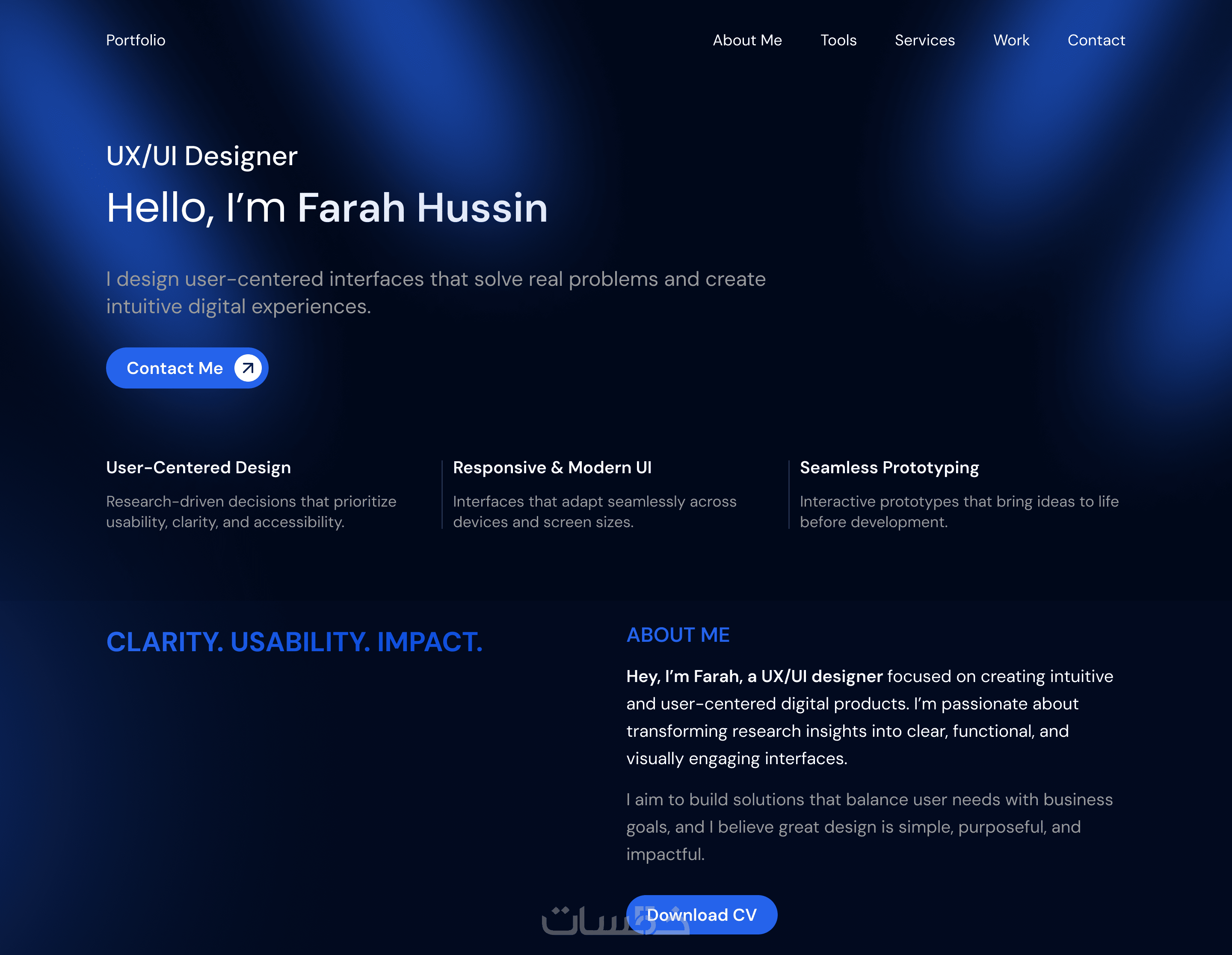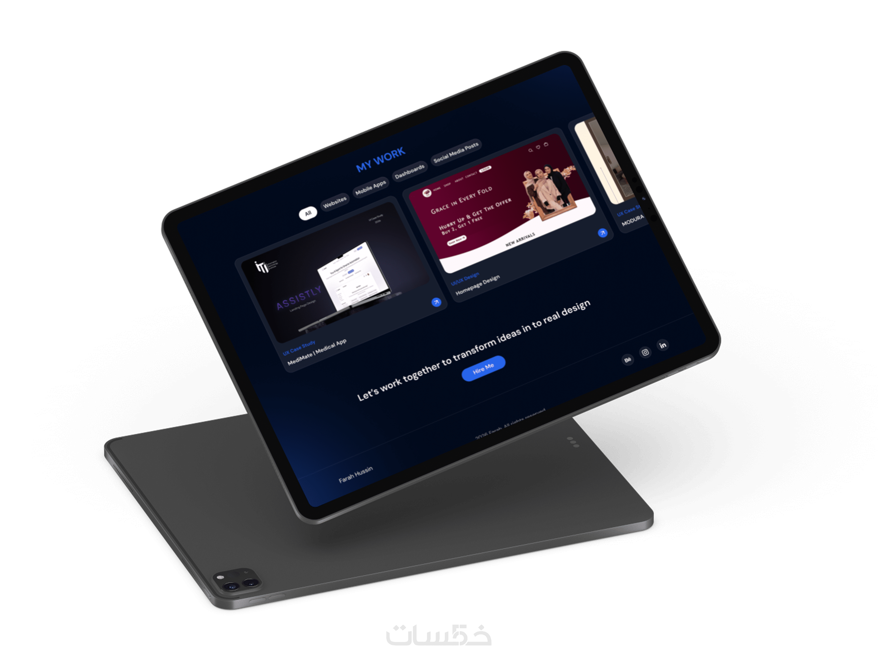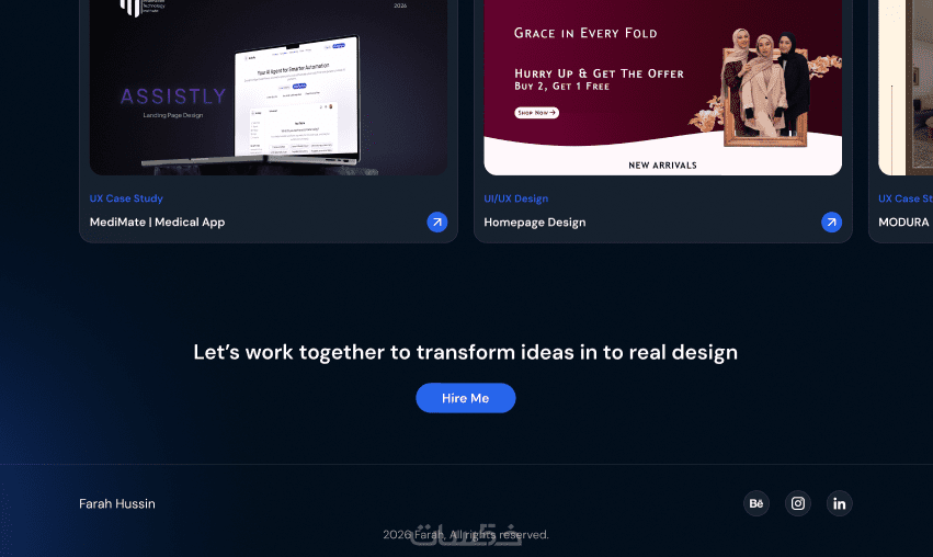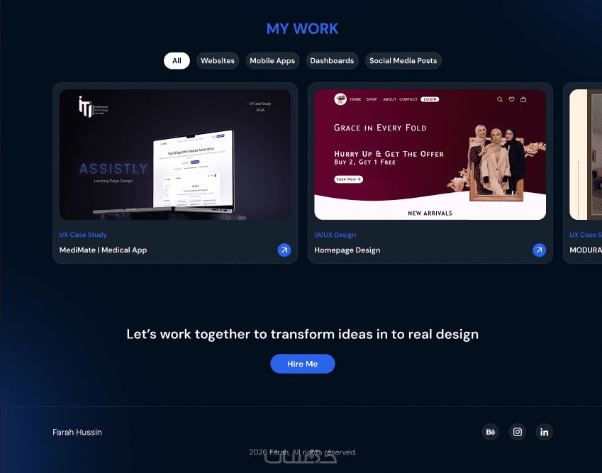 هل تريد portfolio يعكس مهاراتك ويترك انطباعاً احترافياً منذ اللحظة الأولى؟ أصمم لك portfolio شخصي عصري وجذاب باستخدام Figma، يبرز أعمالك بأفضل صورة ويساعدك على استقطاب العملاء أو أصحاب العمل.
