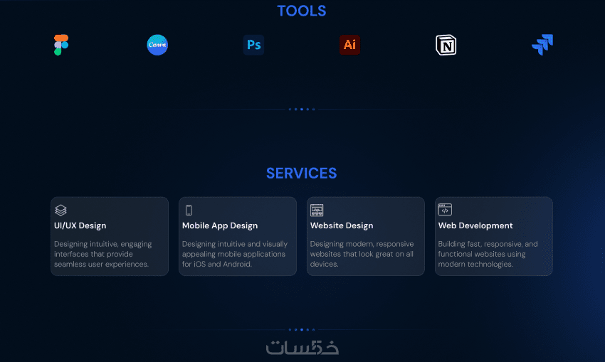 (من أنا – المهارات – الأعمال – الخدمات – آراء العملاء – تواصل معي)