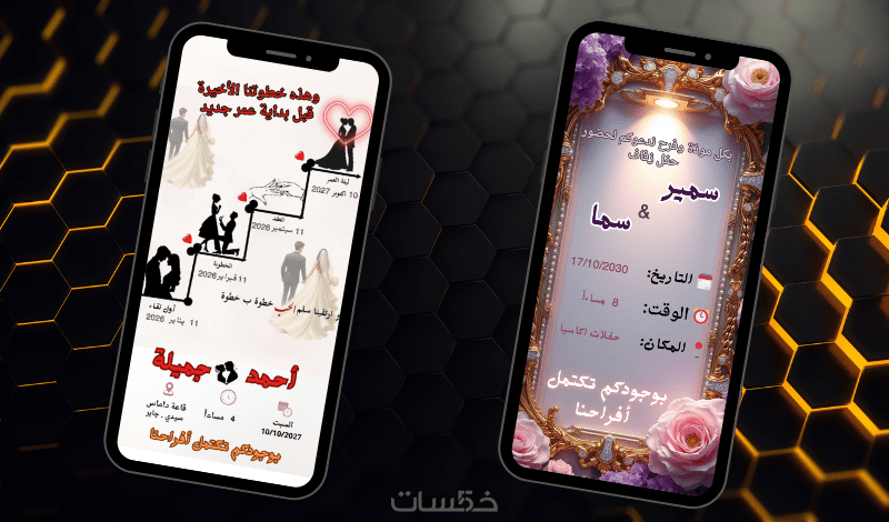 خدمات تصميم دعوات زواج تشمل تصميم بطاقة دعوة إلكترونية على شكل صورة أو فيديو مصممة بأحد برامج التصميم الاحترافية، تعبر عن مناسبتك وتتضمن المعلومات الخاصة بالزفاف مثل اسم صاحب الدعوة والعنوان والتوقيت.