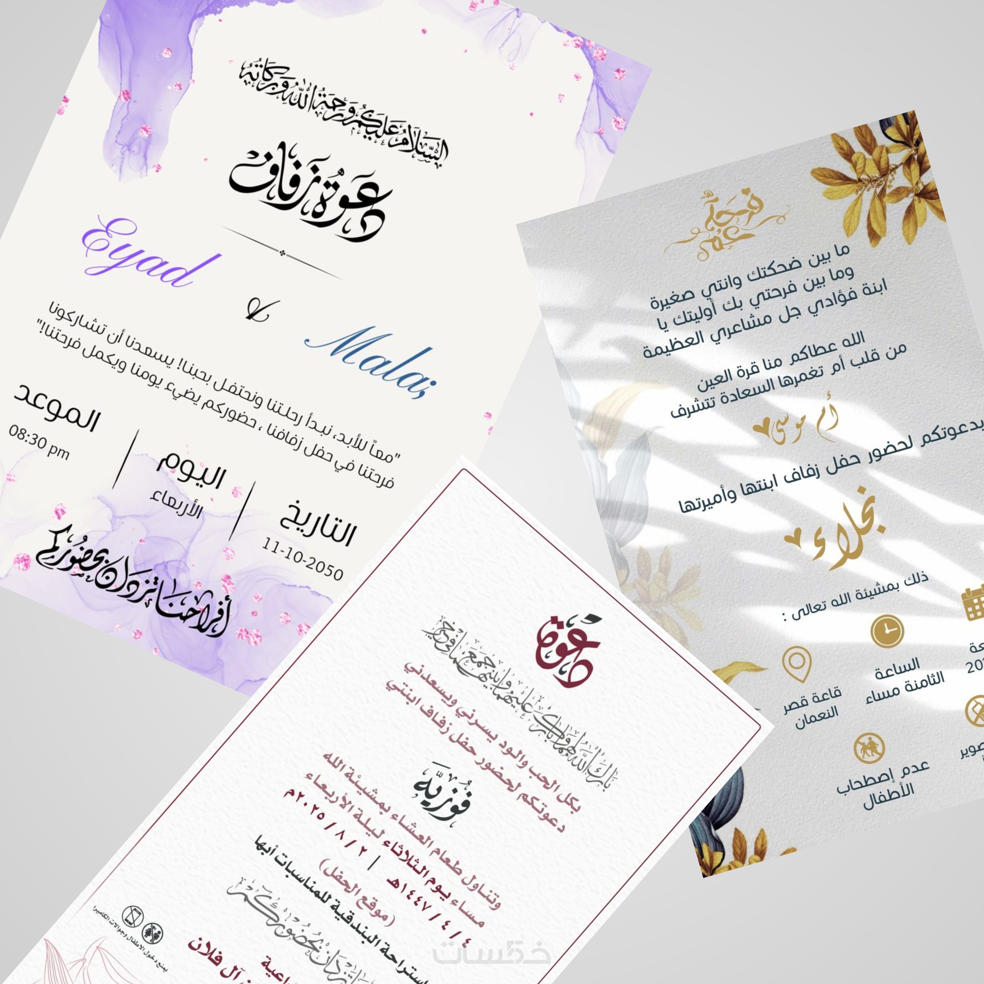 أقدم لكِ خدمة تصميم دعوة زفاف نسائية فريدة وراقية، بتصاميم عصرية أو كلاسيكية حسب رغبتكِ، مع إمكانية التخصيص الكاملة لتناسب رؤيتكِ الخاصة.
