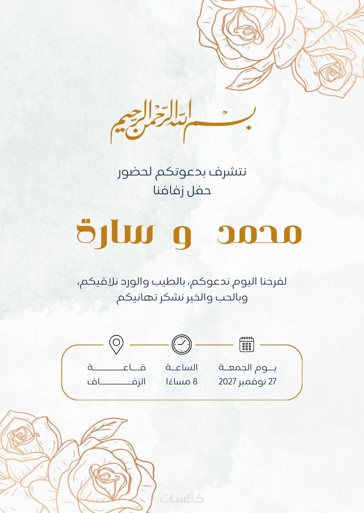 أقدم لك تصميم دعوة زفاف مميزة وجذابة يمكن مشاركتها بسهولة عبر وسائل التواصل الاجتماعي أو طباعتها بجودة عالية.