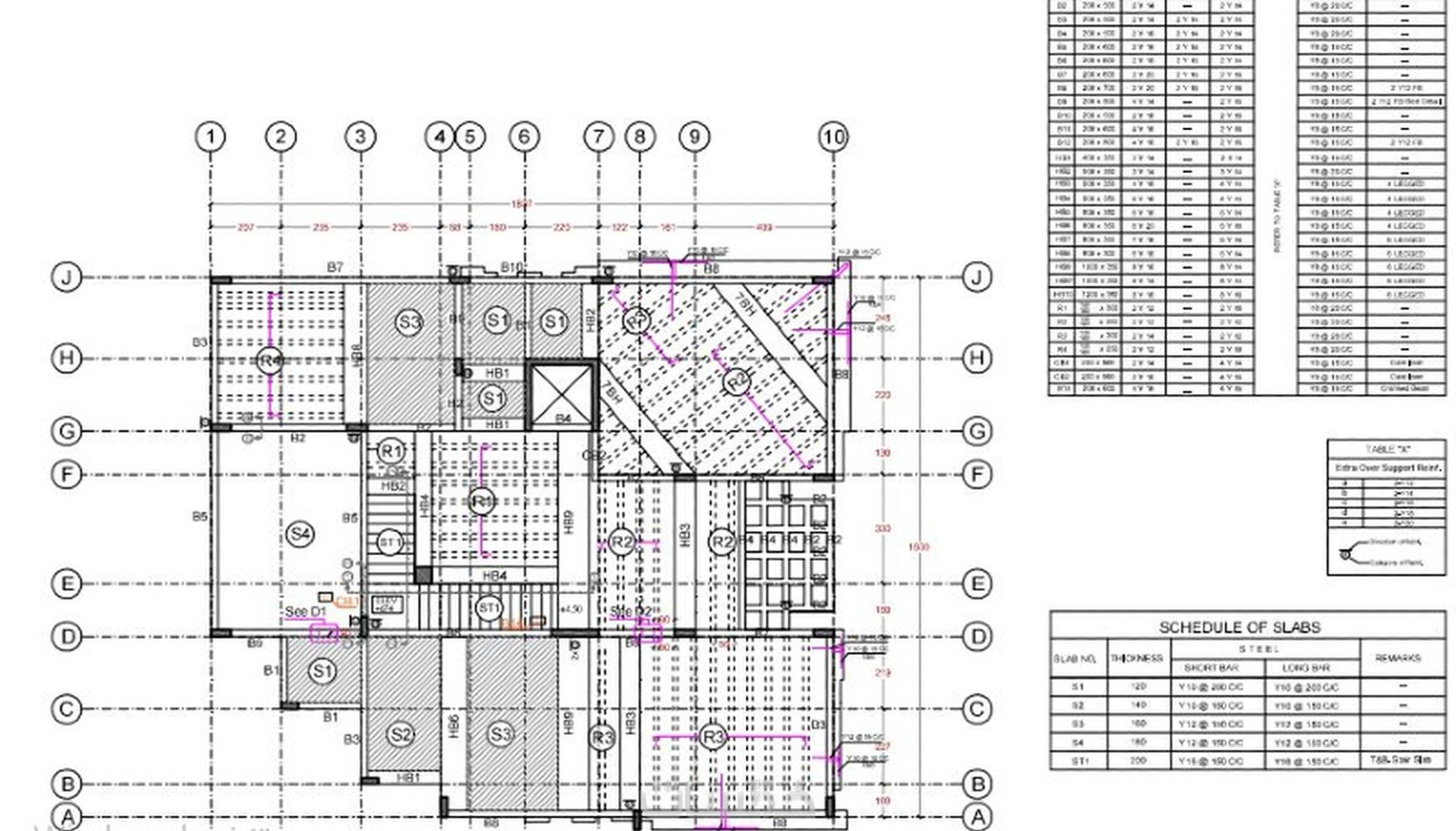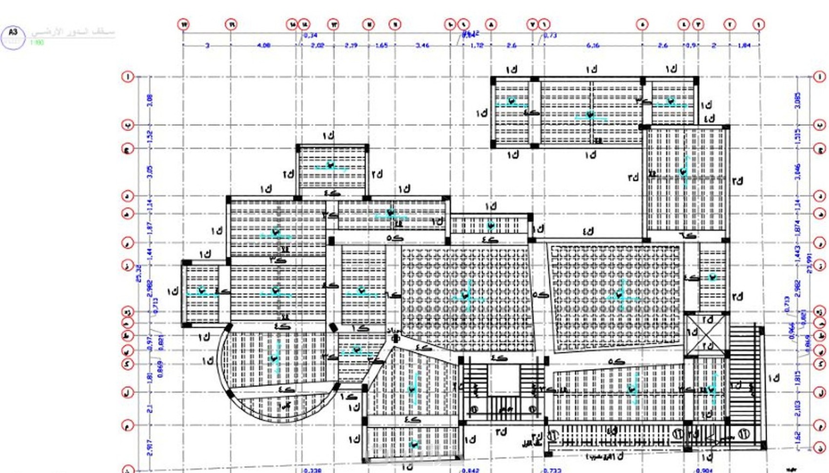 1- المخططات الانشائية كاملة وفق الكود العربي السوري وتشمل مخططات القواعد والميد والاعمدة والاسقف والكمرات . ..