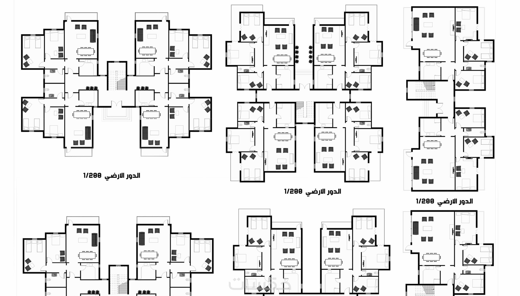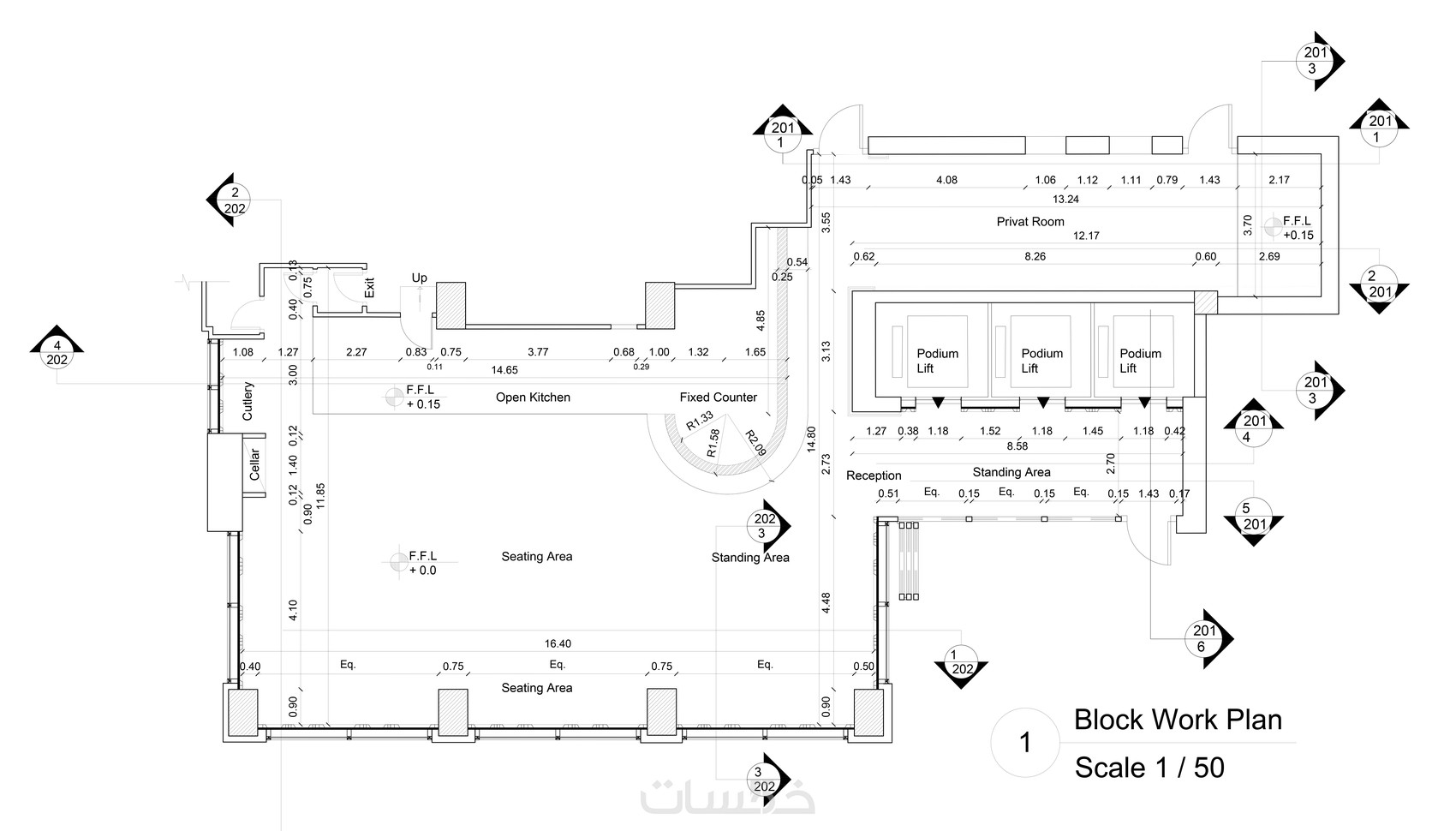 - تحتوي المساقط الأفقية على كافة المعلومات الأساسية ( أسماء الفراغات - الأبعاد - ممرات الحركة الرئيسية و الفرعية - مقياس الرسم ) لمساحة 50 متر مربع