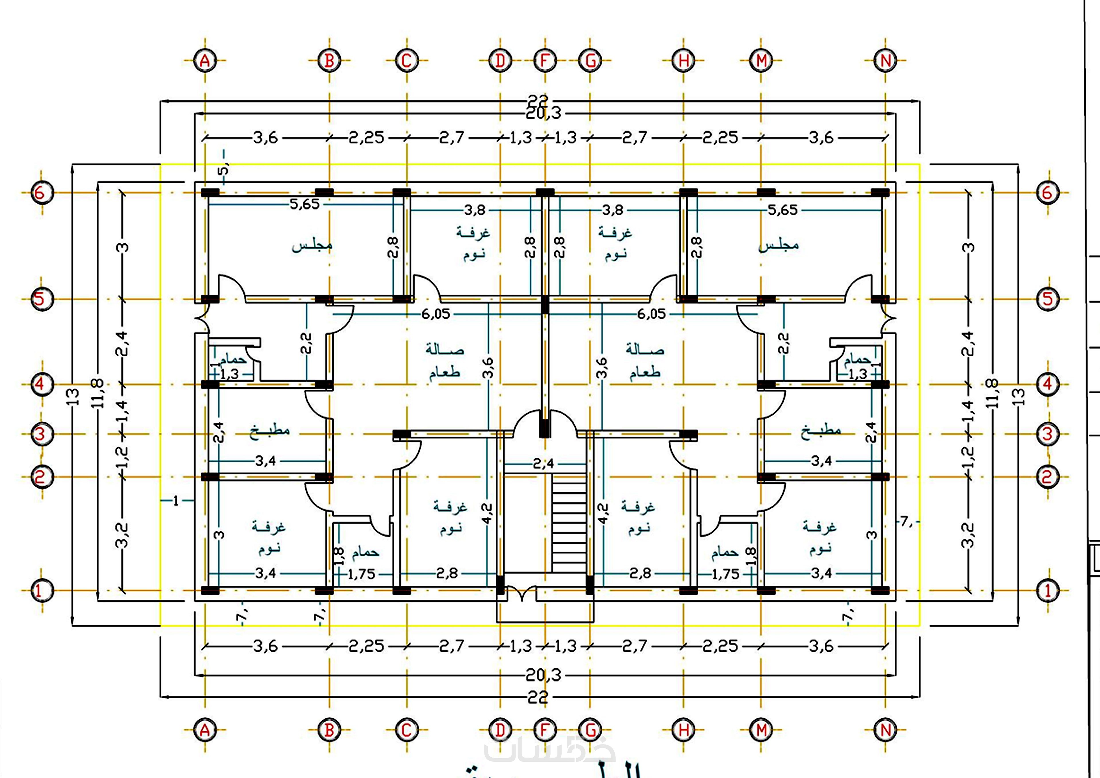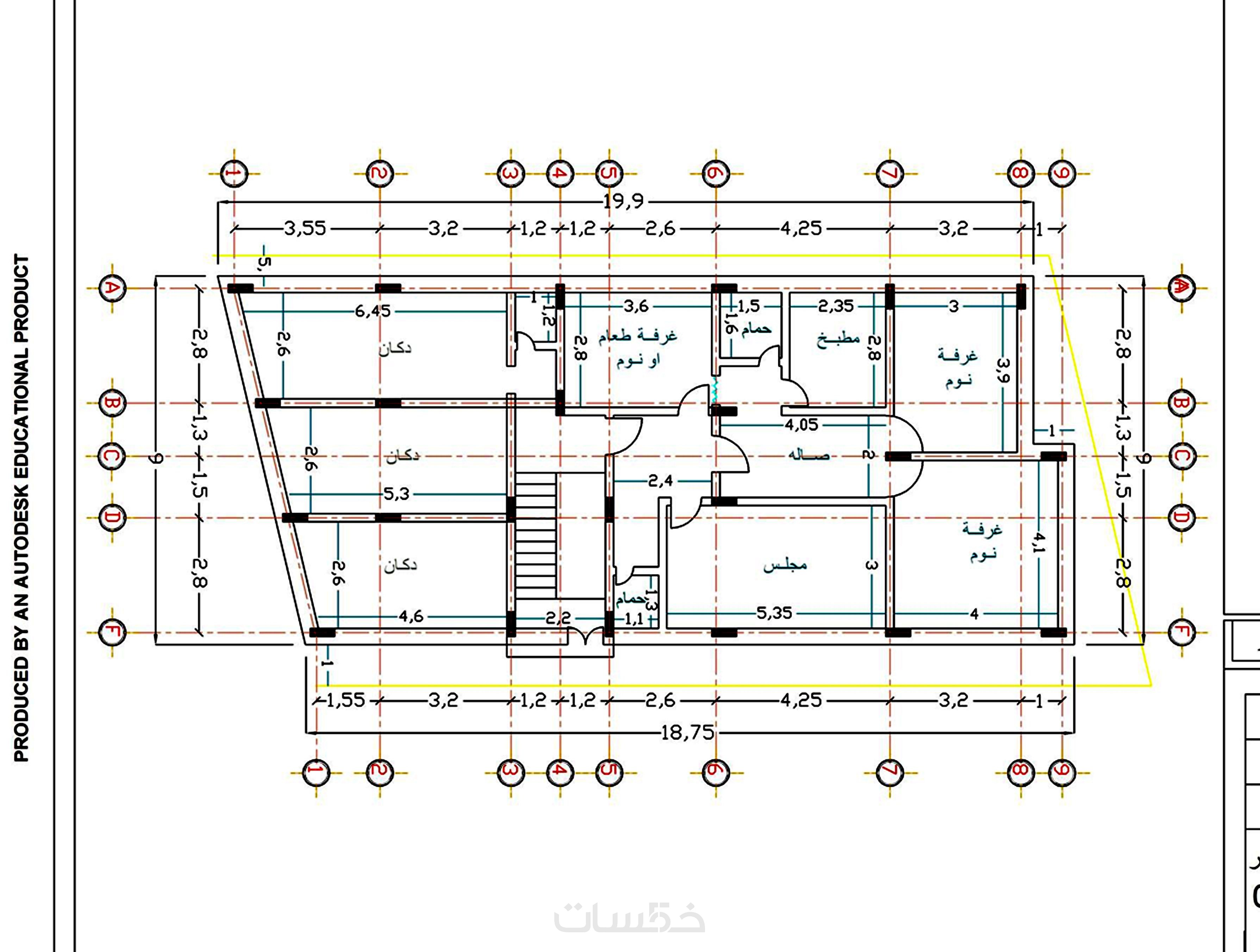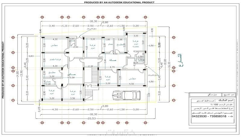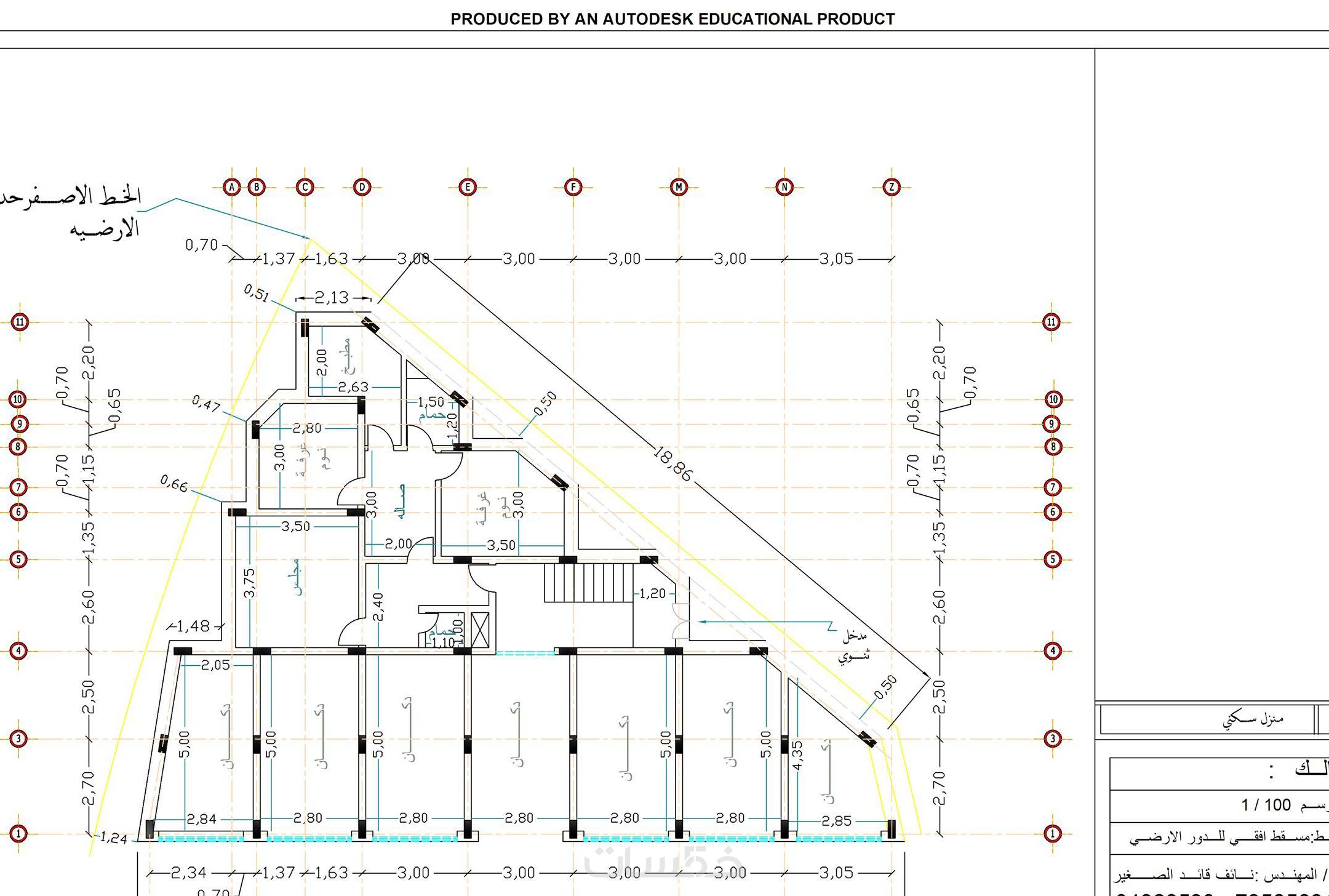تجهيز مخطط الدور الارضي تنفيذي مع المحاور وتوزيع الاعمدة لكل 100 متر مربع