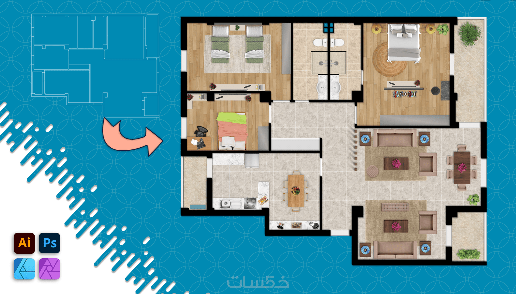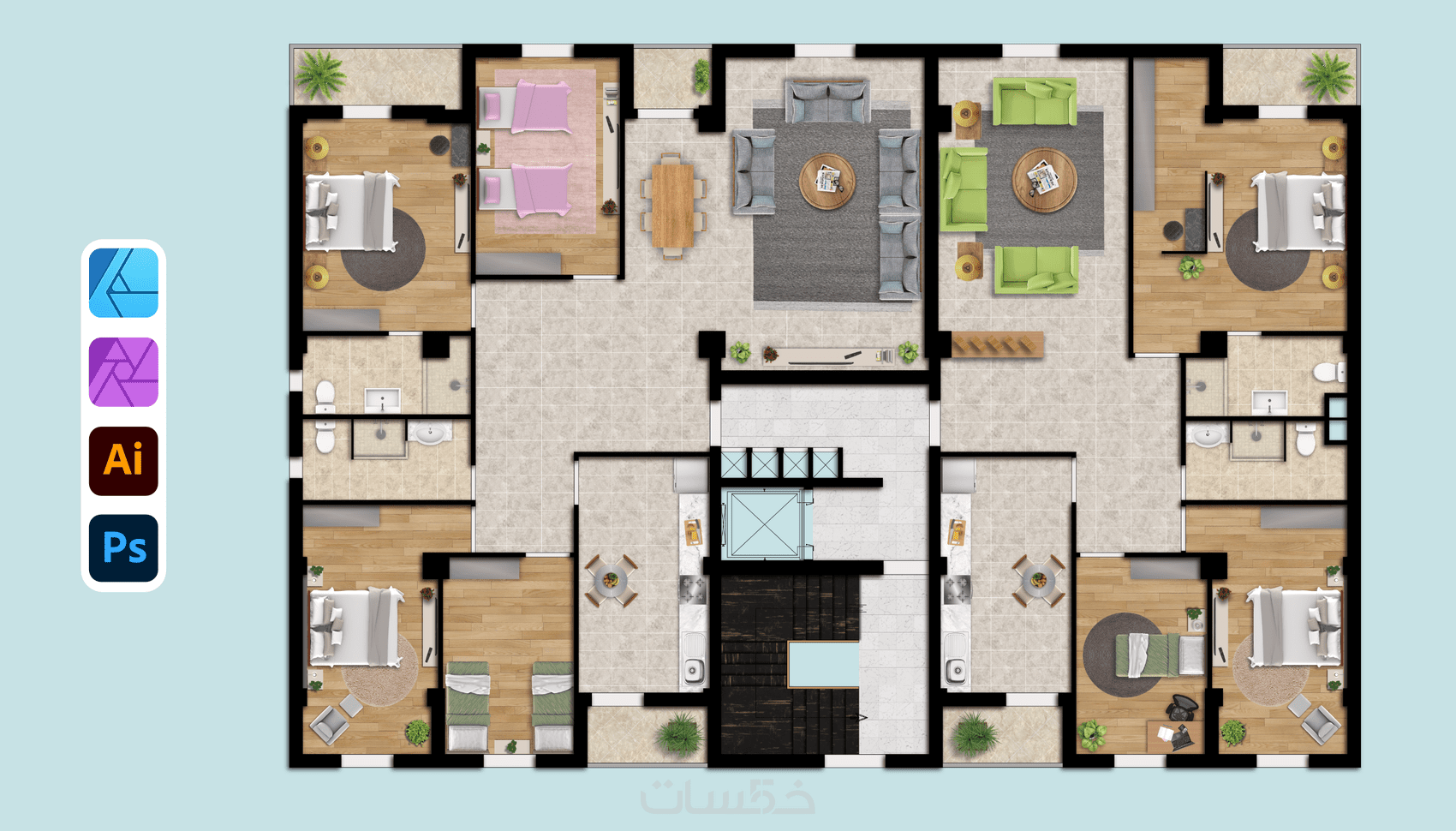 إظهار وتلوين وتنسيق الأثاث لمخطط شقة واحدة 200م² (4 غرف + مطبخ + غرفة معيشة + حمامات)