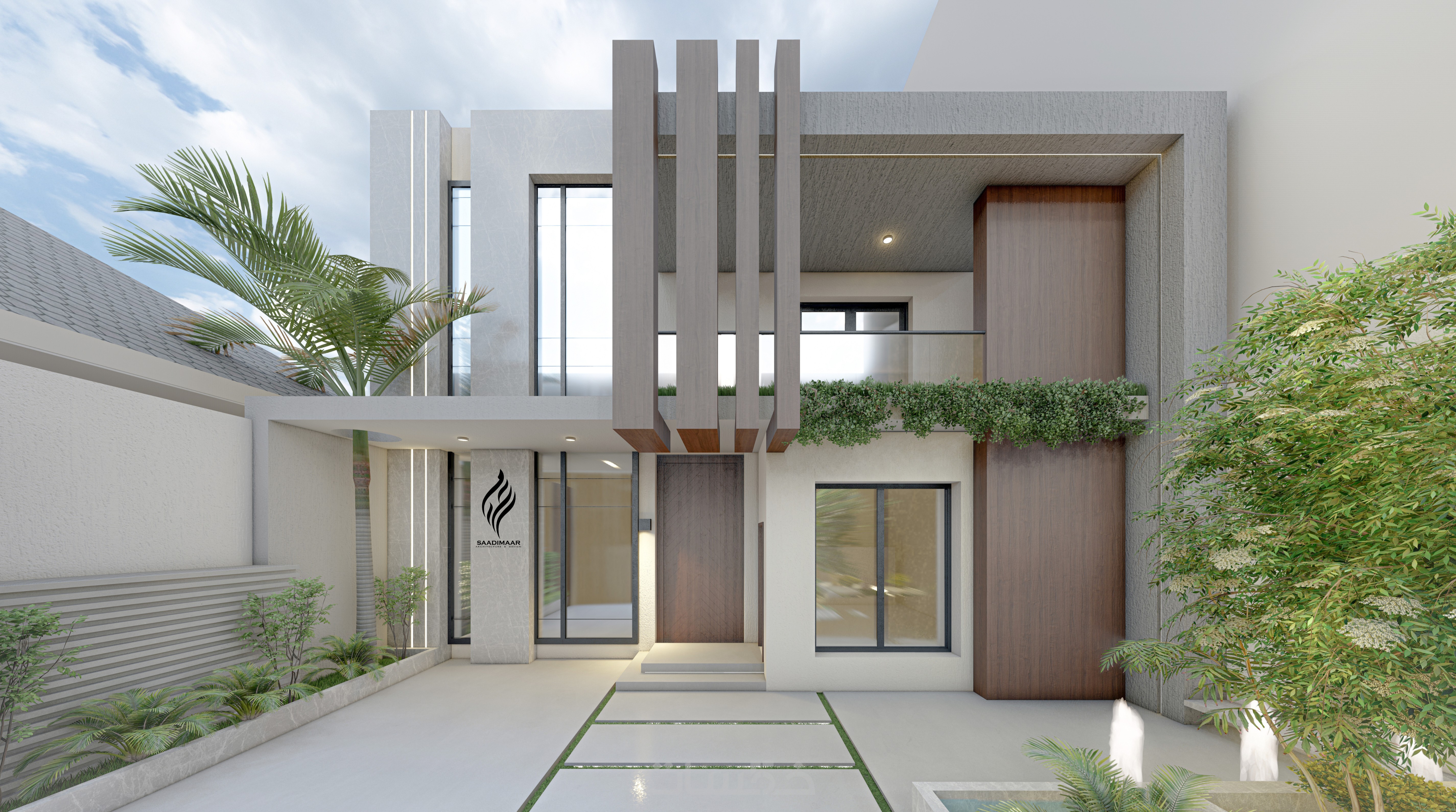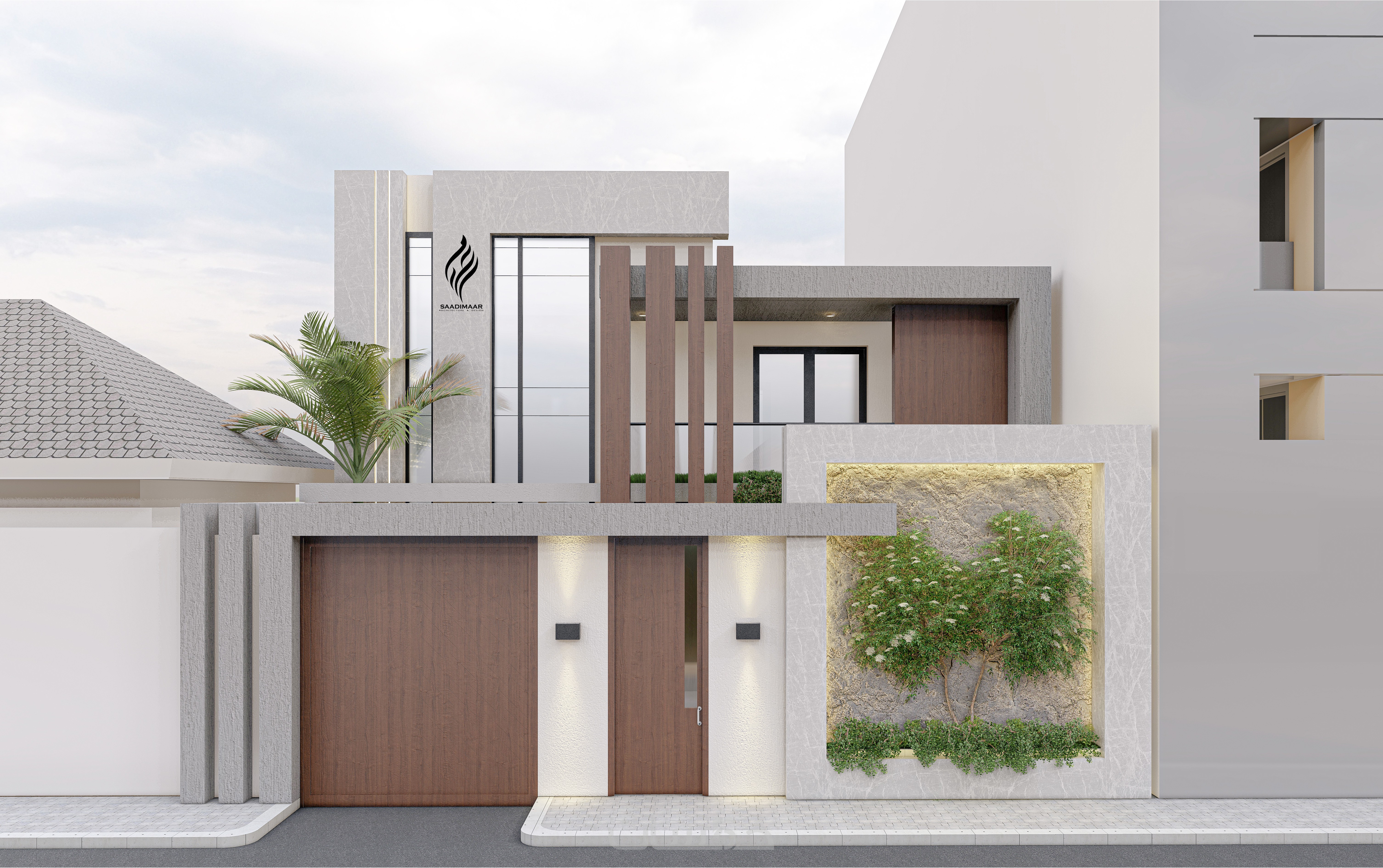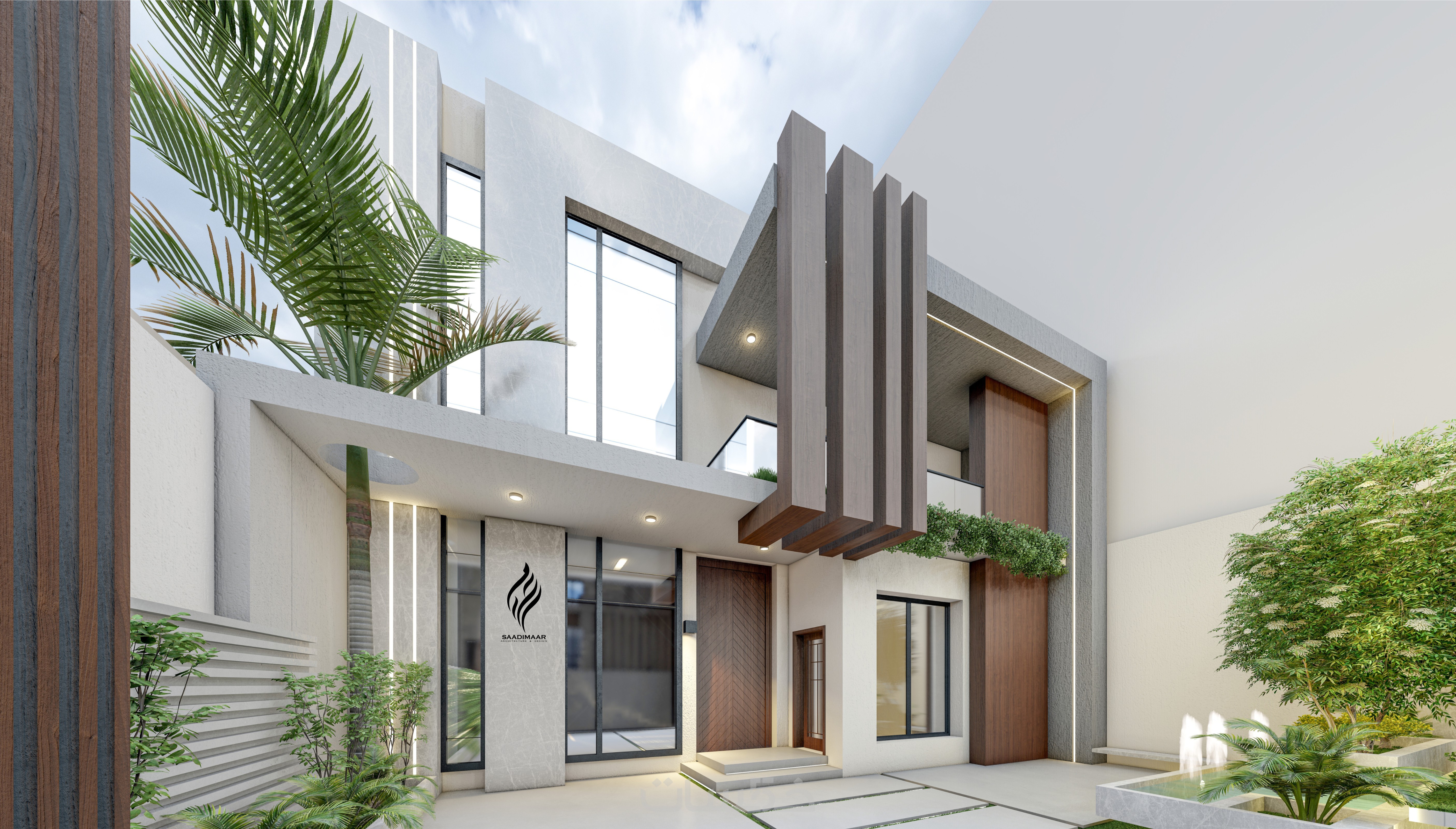الواجهة المعمارية جاءت بخطوط نظيفة ومعاصرة، مع إبراز التباين بين الكتل والفراغات، وفتح مساحات مدروسة تُبرز العلاقة بين الداخل والخارج.