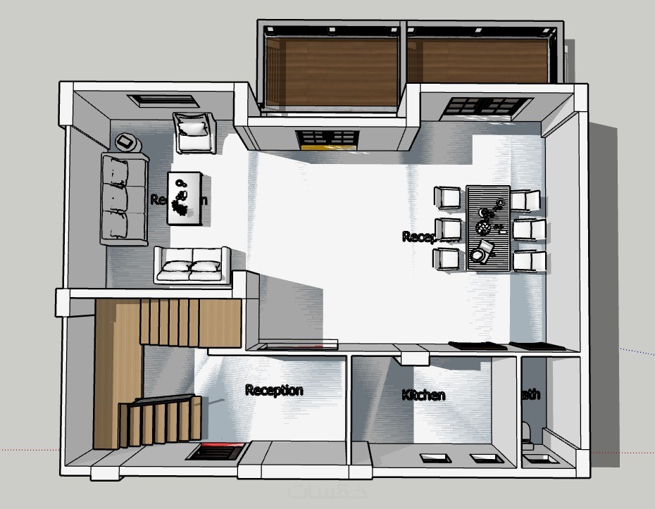 يتم تنفيذ المشروع باستخدام برنامج SketchUp باحترافية عالية مع تنظيم العناصر والمكونات داخل الملف بشكل منظم.