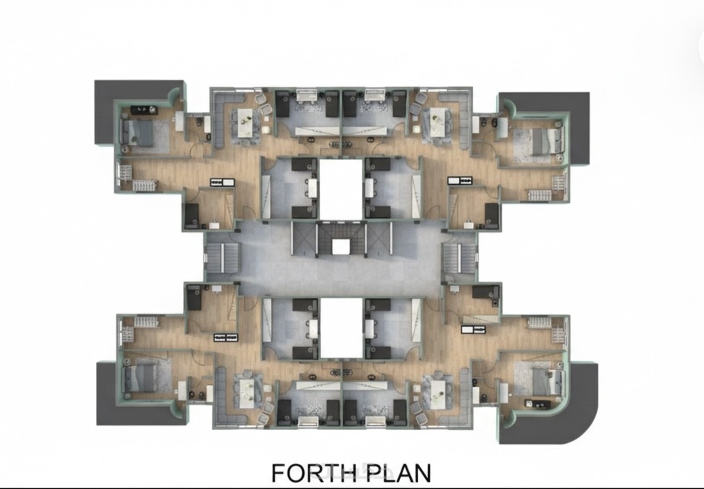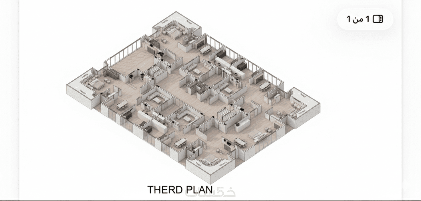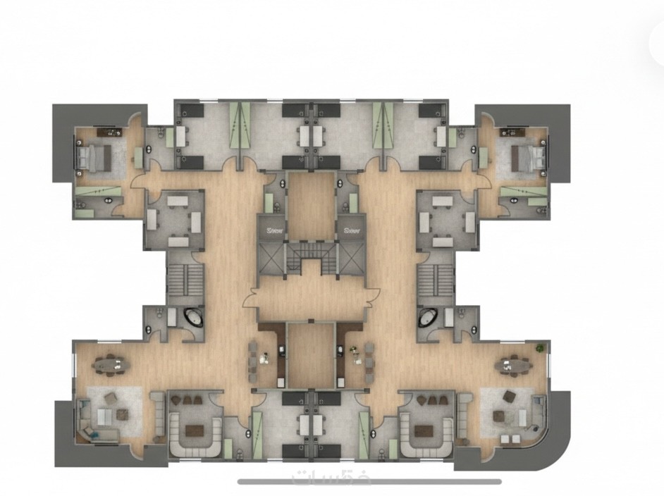 • إضافة الخامات (أرضيات, باركيه، رخام) والأثاث المناسب لكل فراغ.