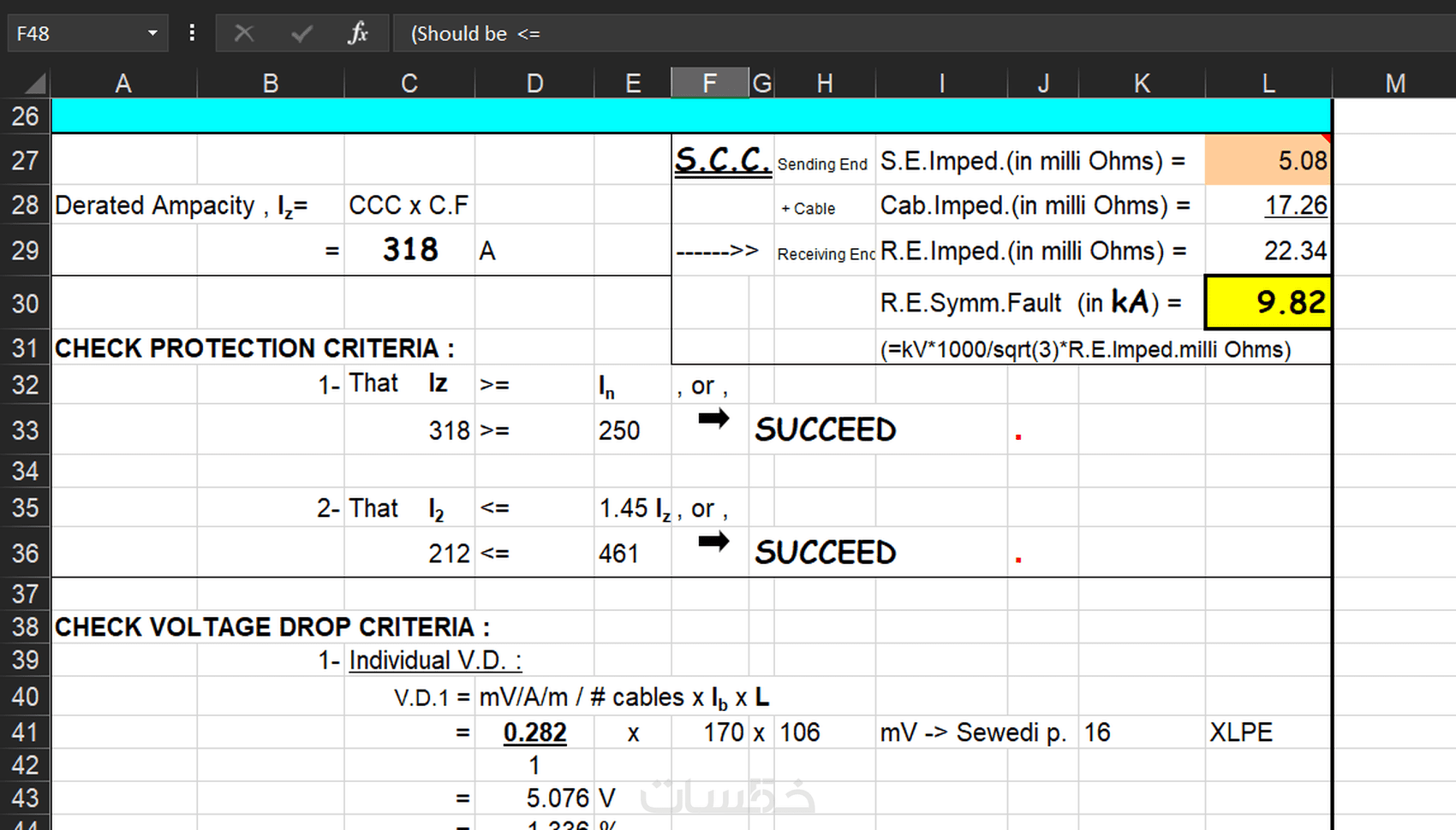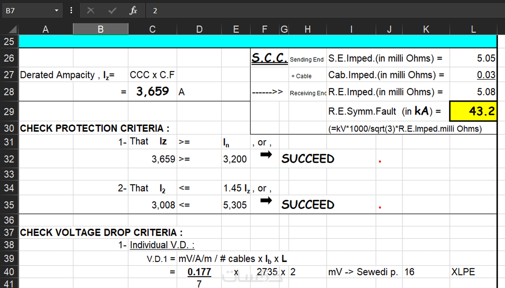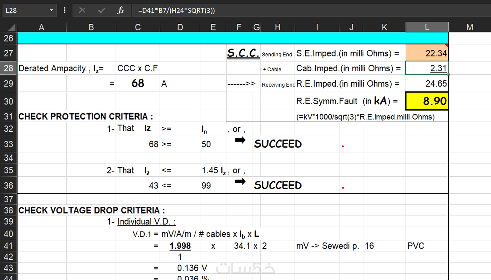 ✔ عمل حسابات انخفاض الجهد في الكابلات وتلاشي هذا الانخفاض (Voltage Drop Analysis)