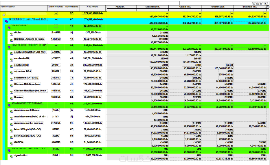 هيكلة كاملة للأنشطة مع تحديد المدد والعلاقات بين المهام.