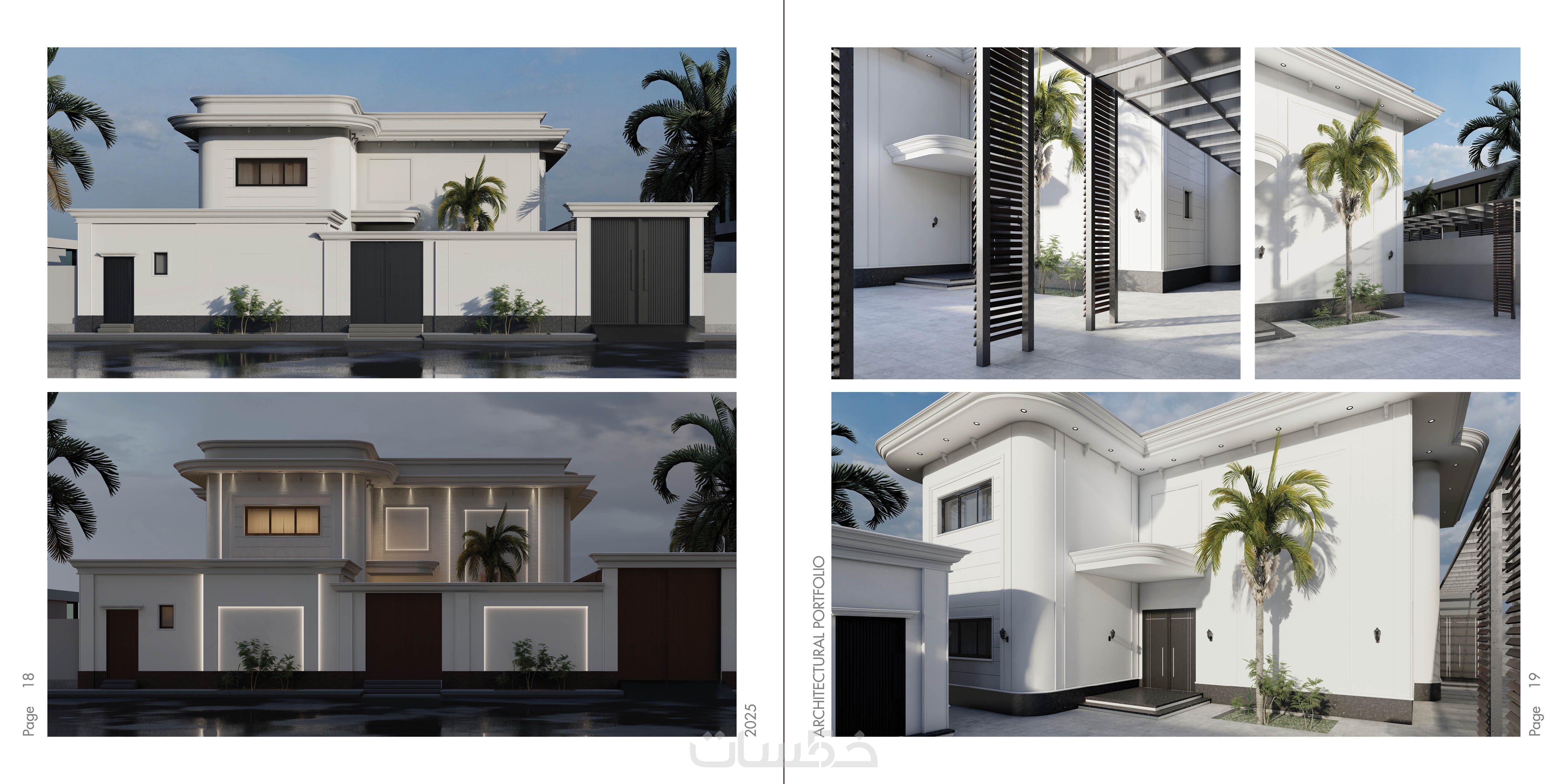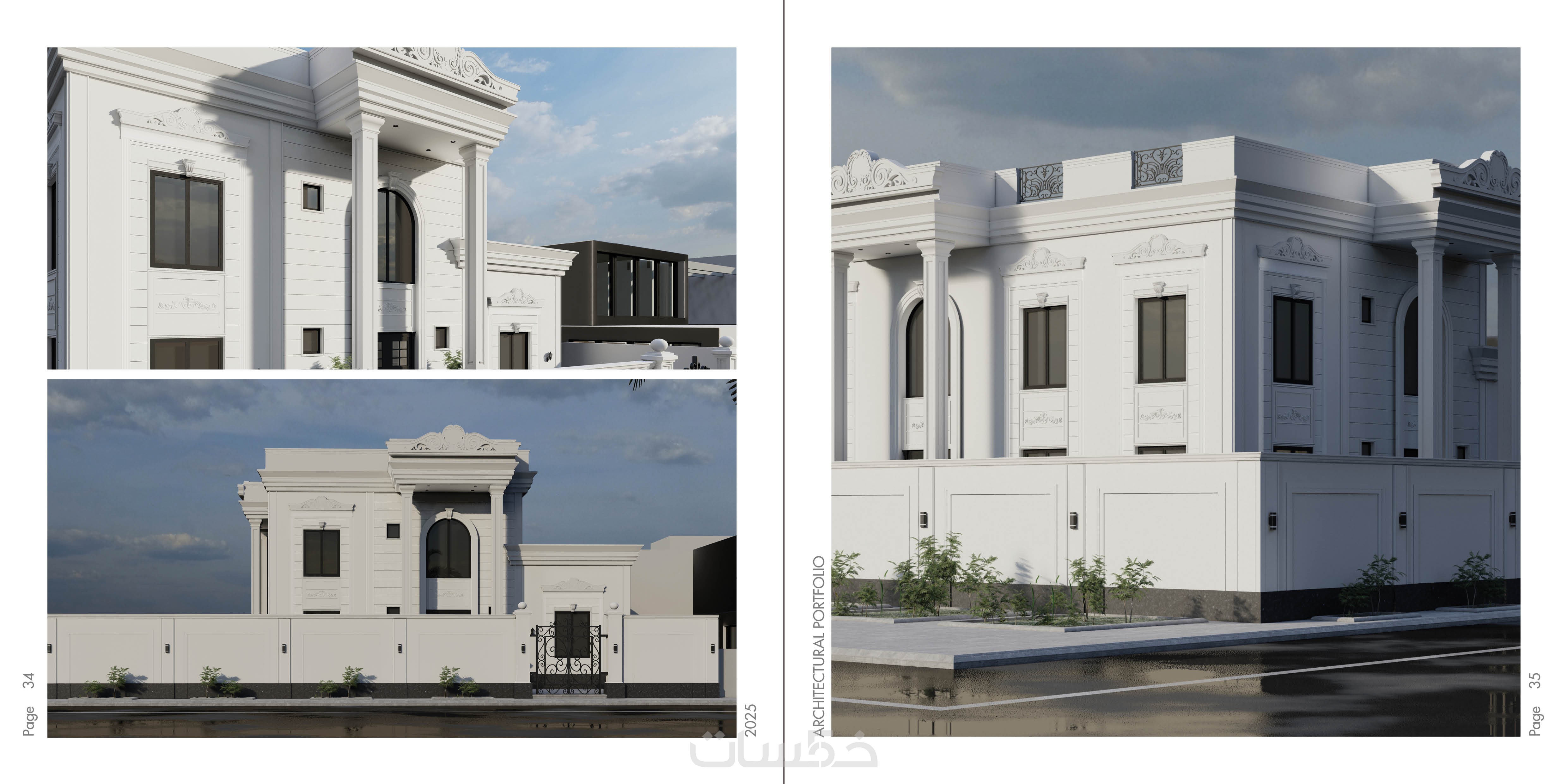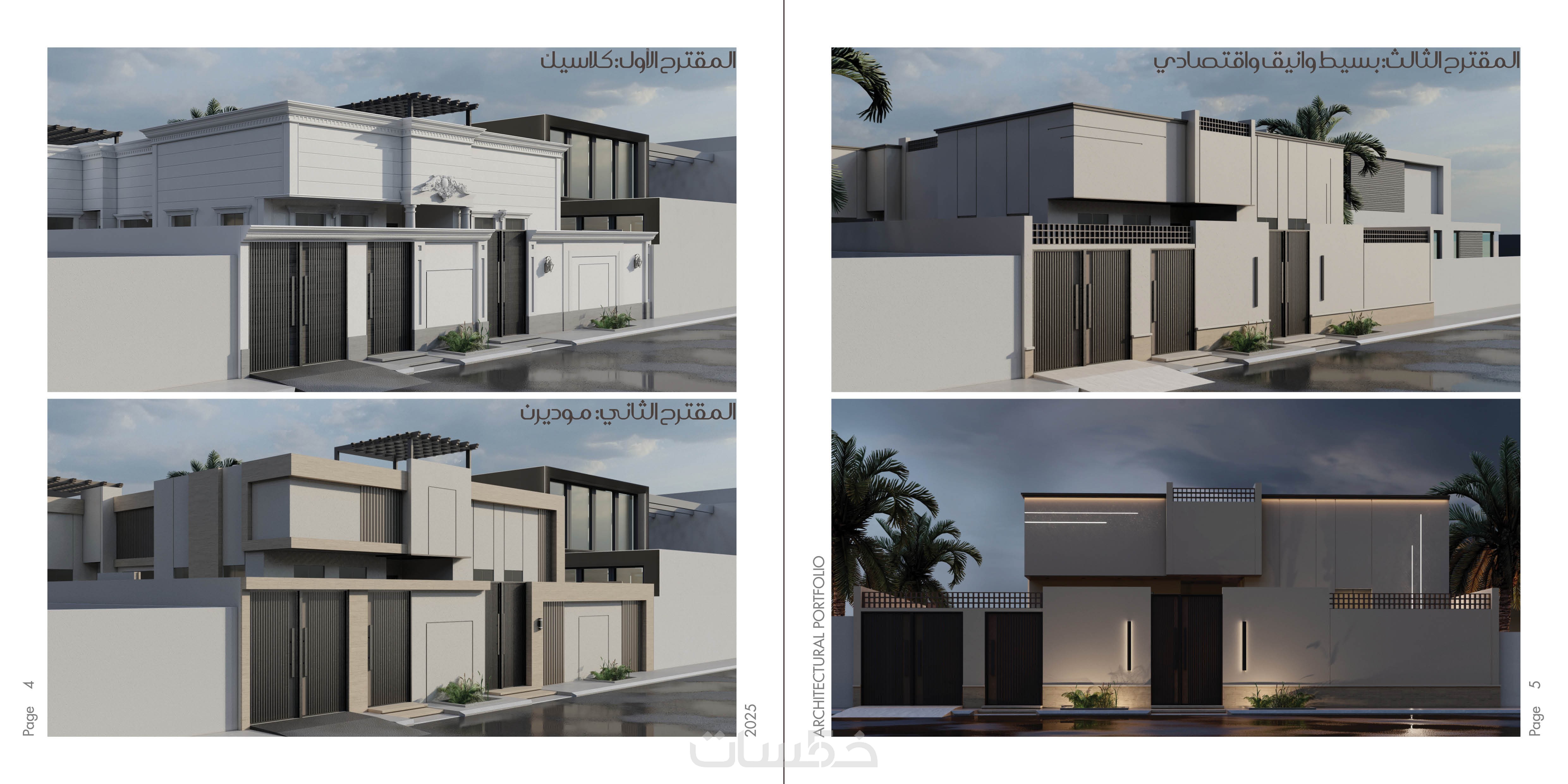 تصميم الواجهات الاضافية الثلاثة للفيلا اضافة للواجهة الامامية والسور (مساحة الفيلا تتجاوز 500 م2)