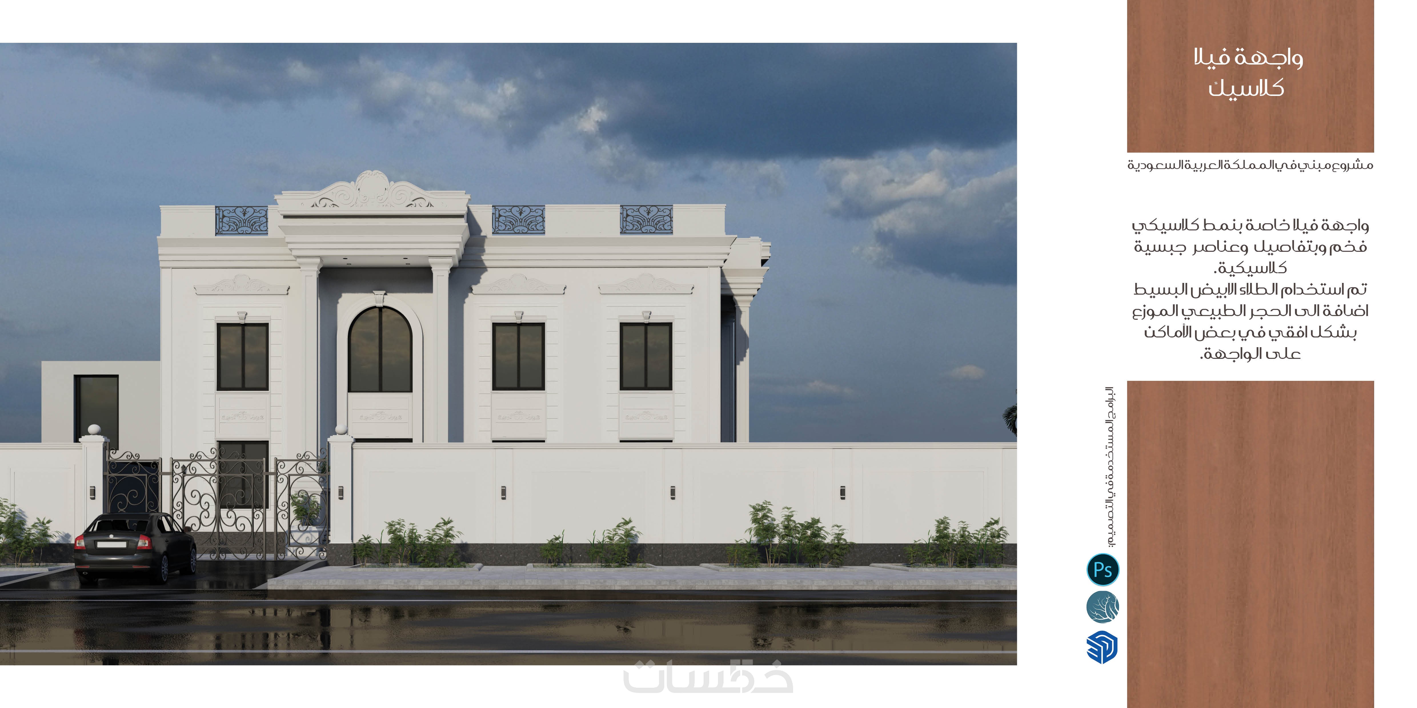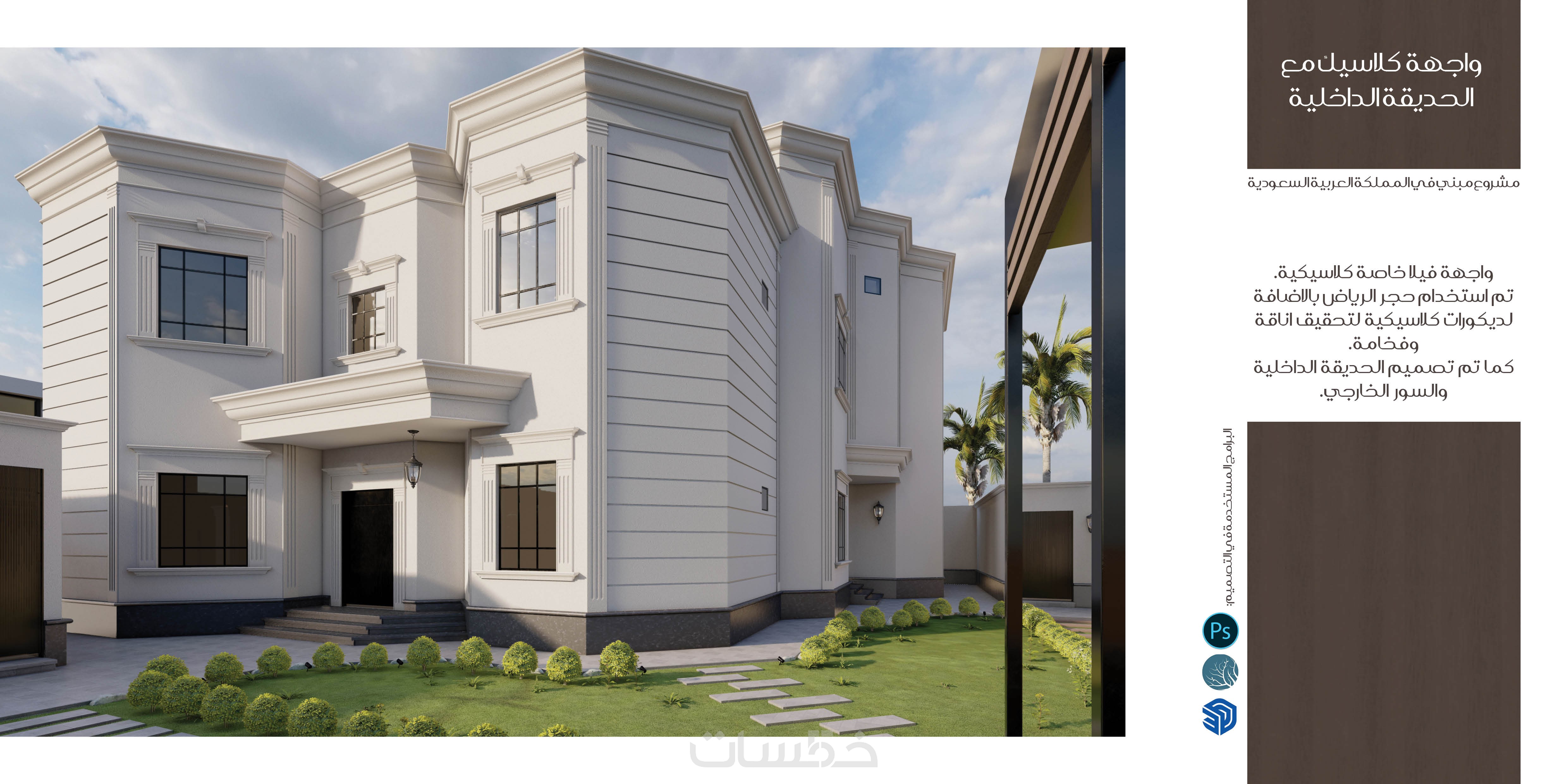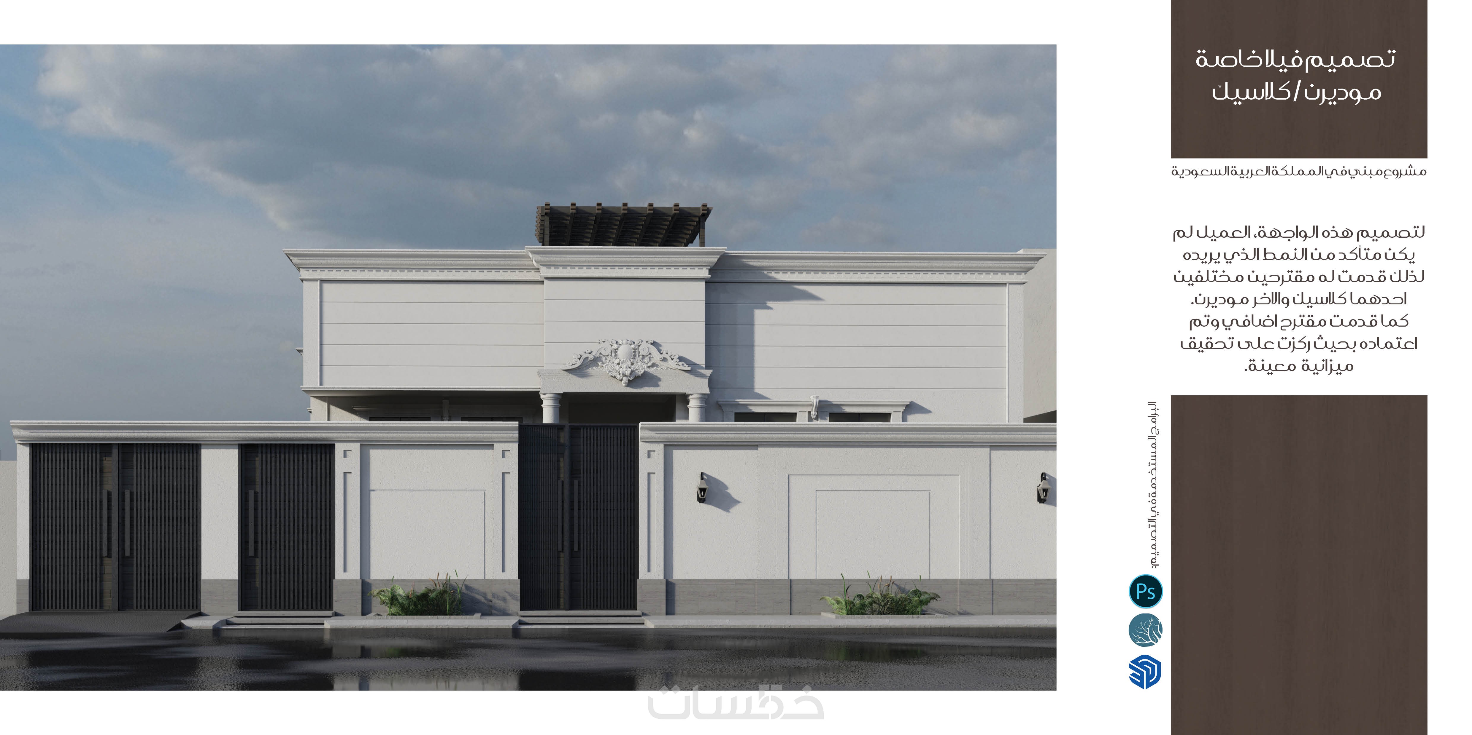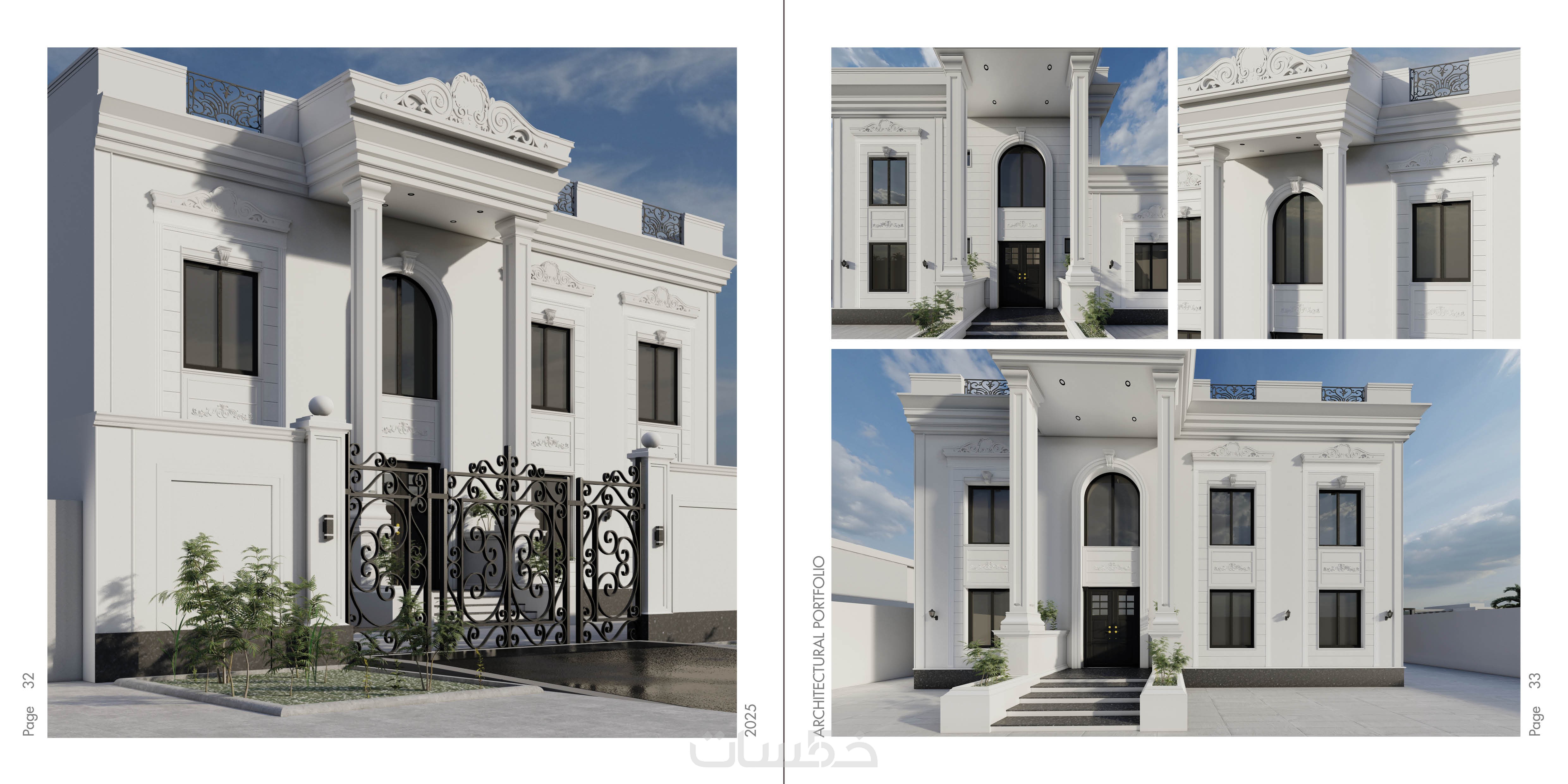 تصميم الواجهات الاضافية الثلاثة للفيلا اضافة للواجهة الامامية والسور (مساحة الفيلا تتجاوز 500 م2)