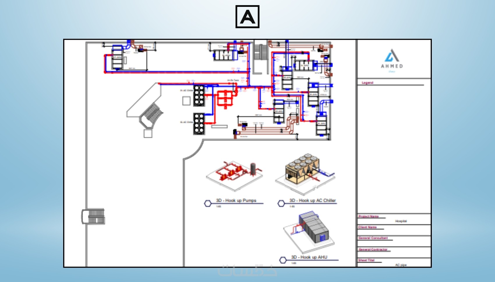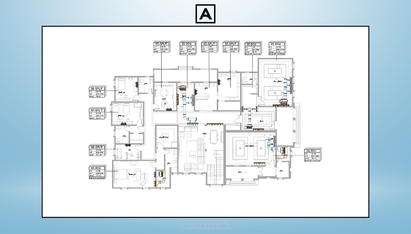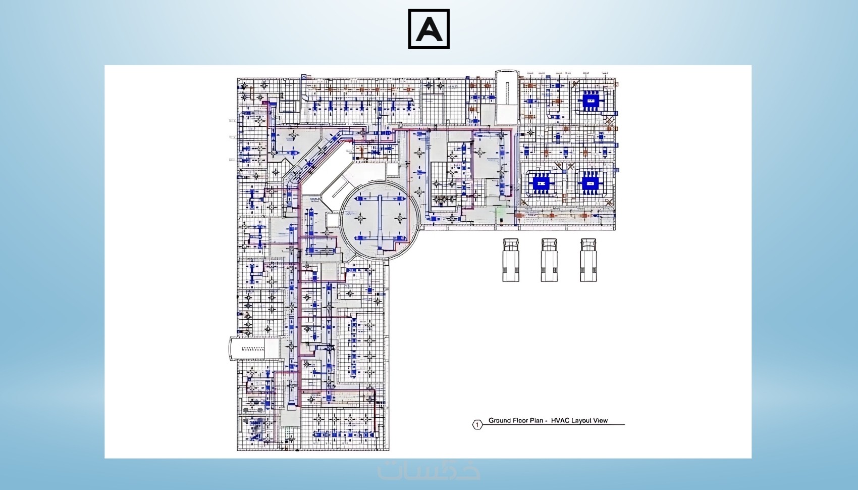 - مخططات دقيقة لمسارات مجاري الهواء وتوزيع وحدات التكييف(FCU, AHU, VRF, Split).