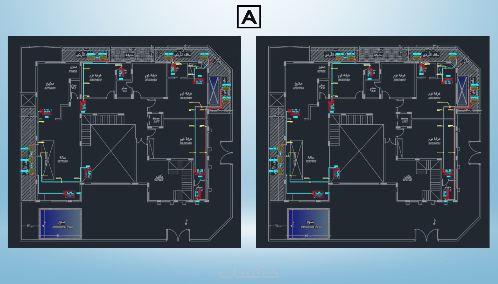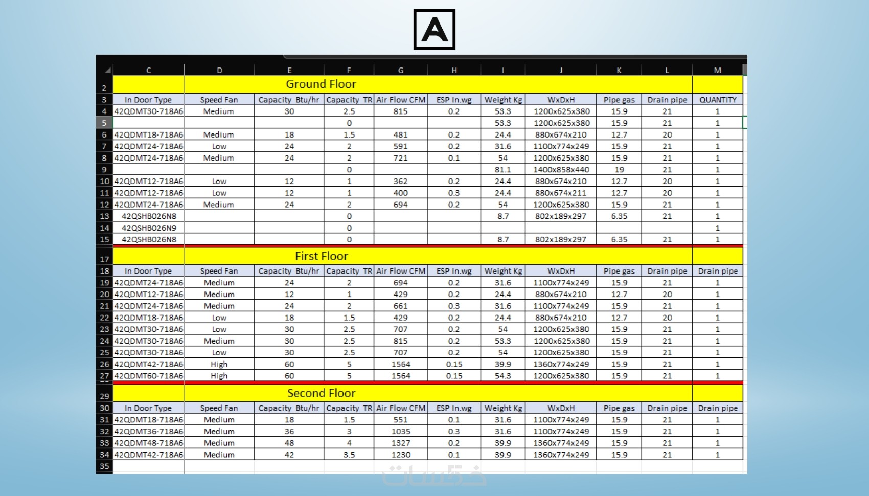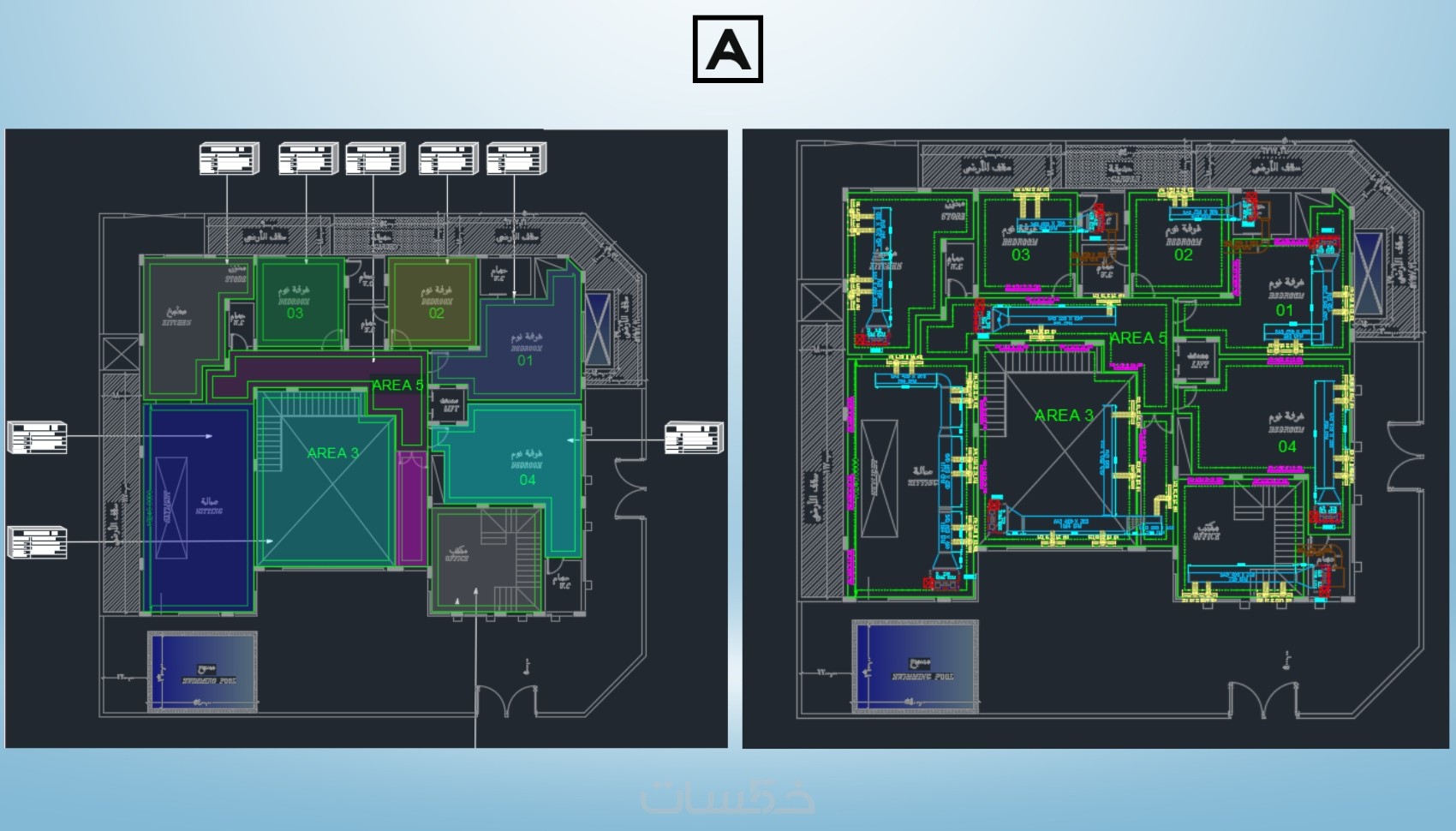 - مخططات دقيقة لمسارات مجاري الهواء وتوزيع وحدات التكييف(FCU, AHU, VRF, Split).