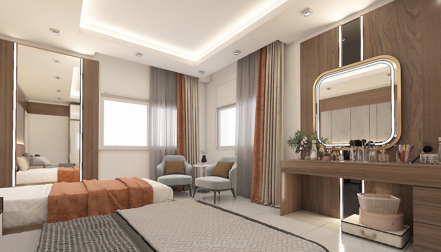 عبارة عن ديكور بسيط حول باب الشقة الرئيسي وخزانة مدخل مألفة من خزانة شاقولية وأخرى صغيرة في الوسط للأحذية مع كرسي ثابت للاستراحة اثناء تبديل الأحذية ومرآة بشكل دائرة غير مكتملة خلفها إنارة مخفية وهناك إنارة متدلية أخرى أيضا تختيم التصميم بواسطة كورنيش خشبي جميل