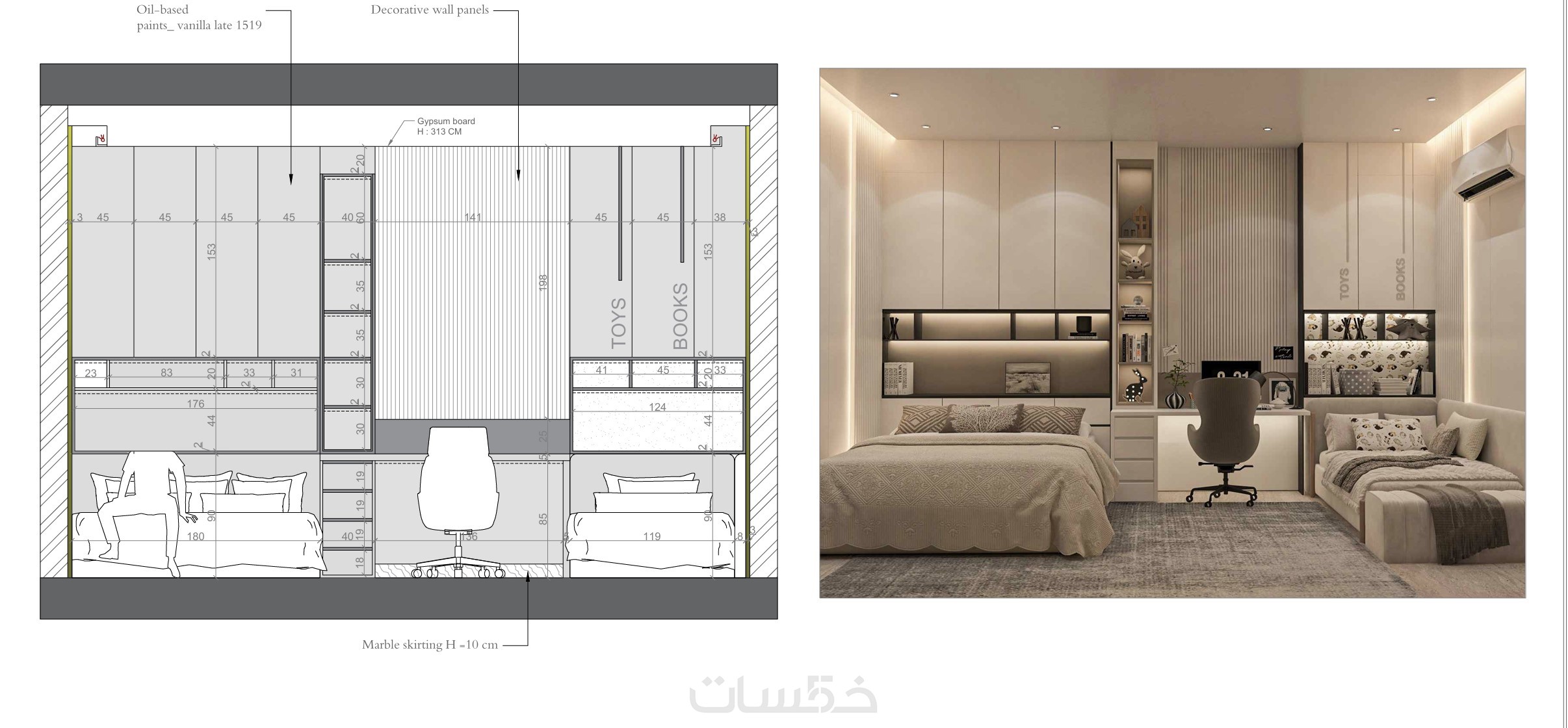 تصميم ثلاث غرف ( نوم او معبشة او مطبخ او مجلس ) مع صور ثري دي للتصميم بمساحة 75 متر مربع