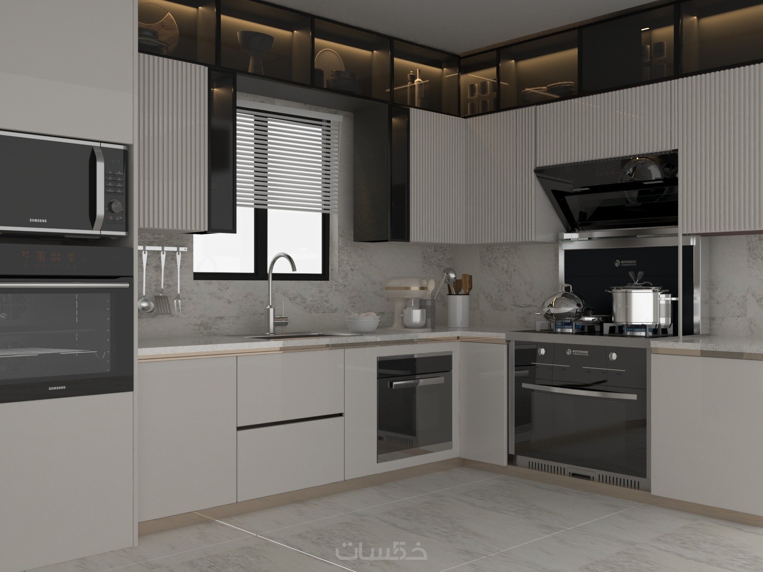 • تصميم مطبخ ثلاثي الأبعاد بأدق التفاصيل مع ألوان وخامات واقعية.