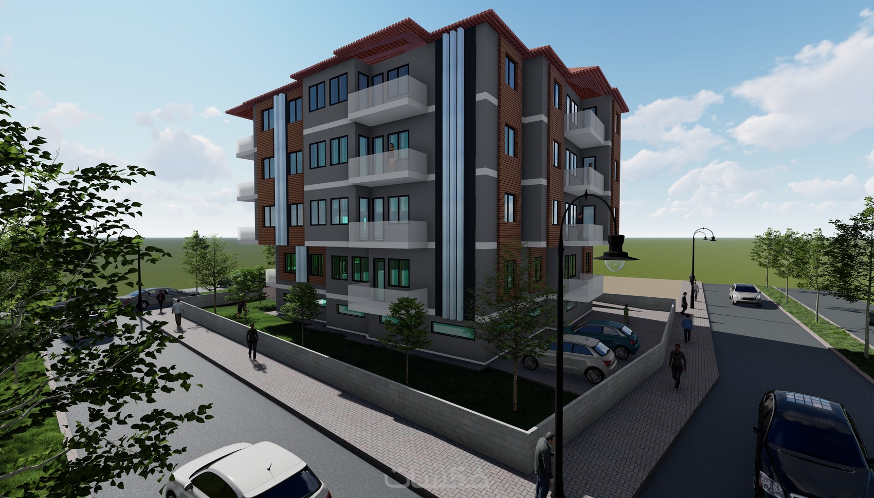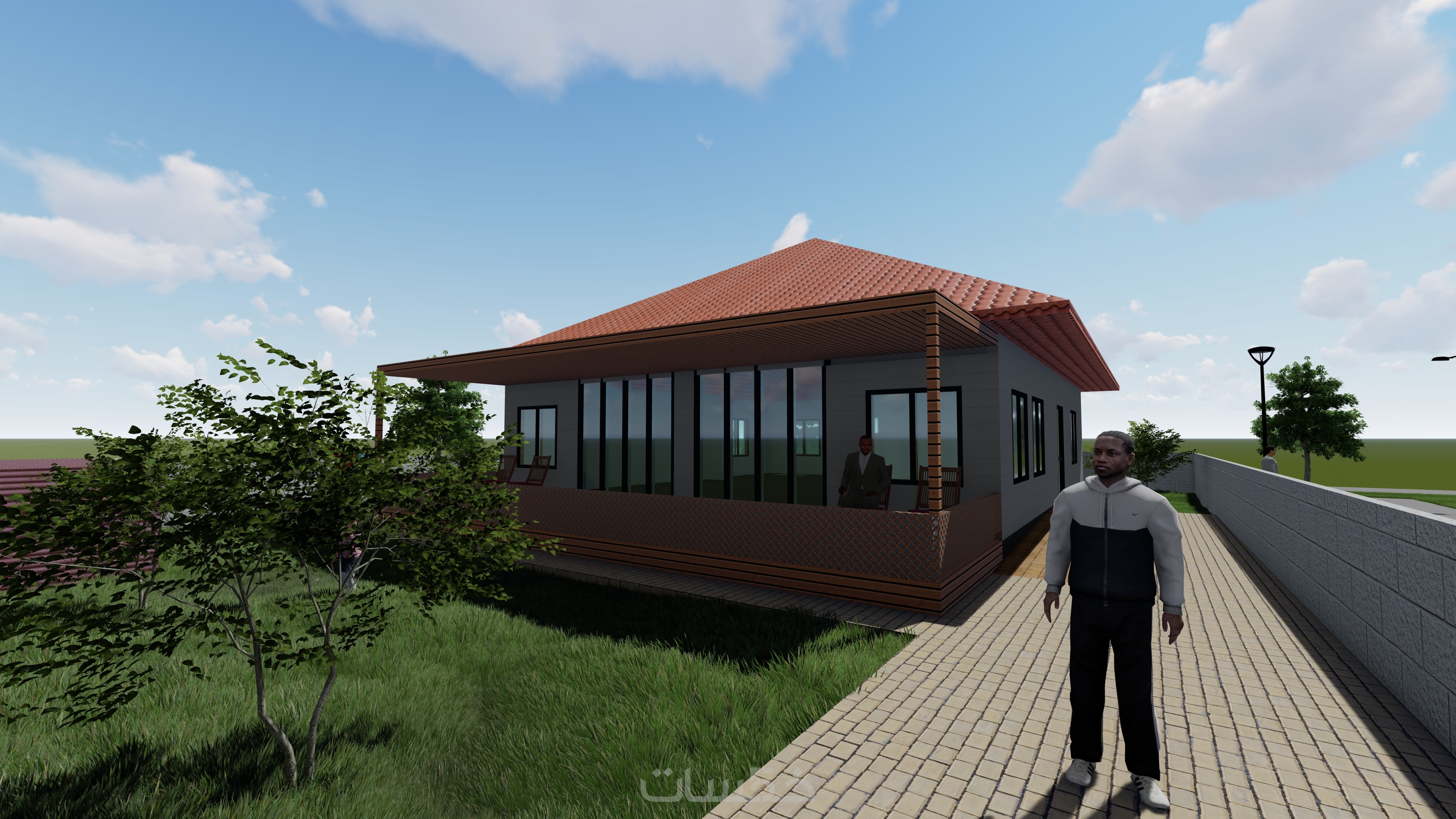 • تصميم داخلي 3D واقعي يوضح توزيع الأثاث والألوان والإضاءة.
