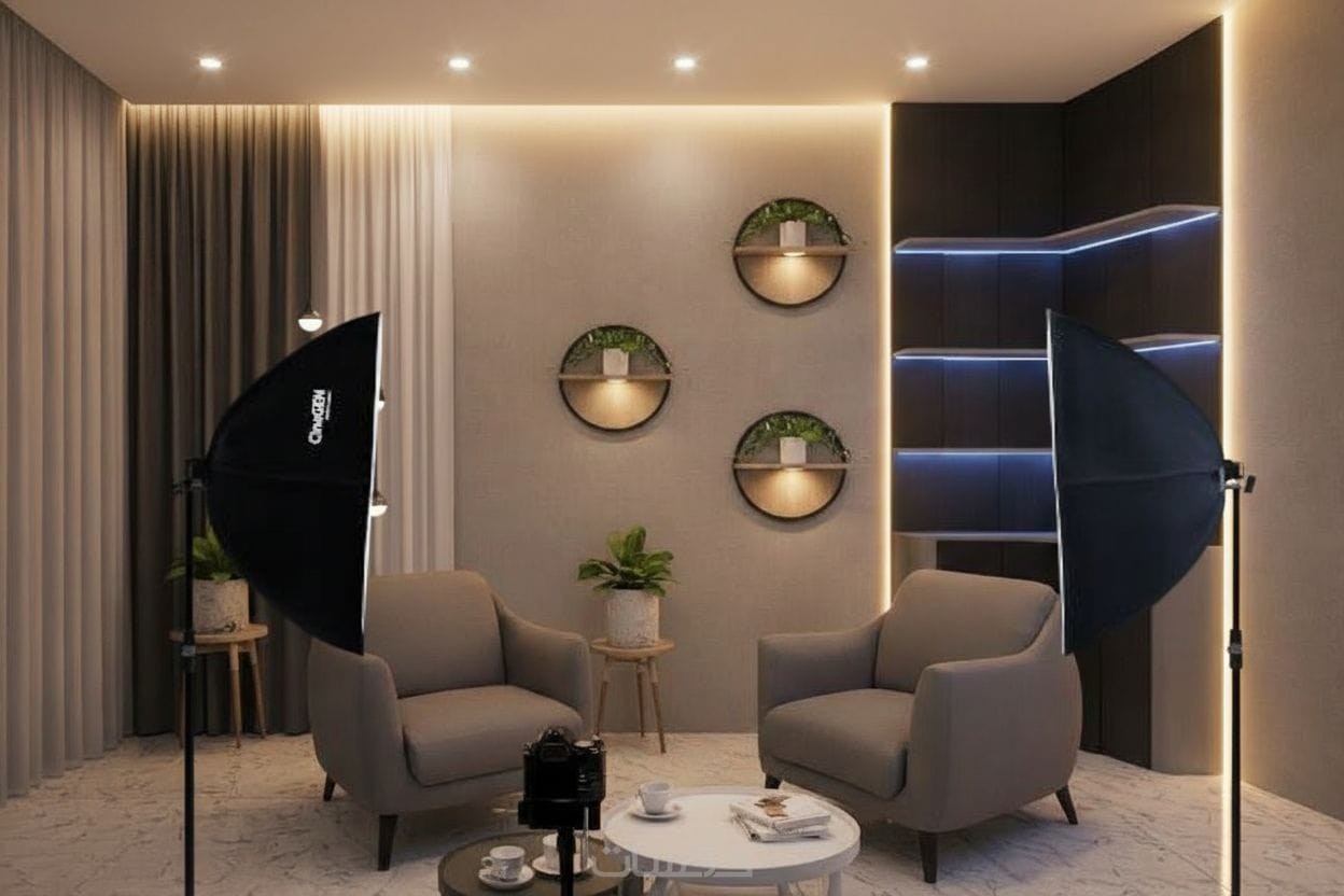 أعمل على استغلال المساحات بشكل ذكي، مع تصميم الجدران، الإضاءة، الأسقف، ومناطق التخزين بما يتناسب مع طبيعة العمل وصناعة المحتوى.