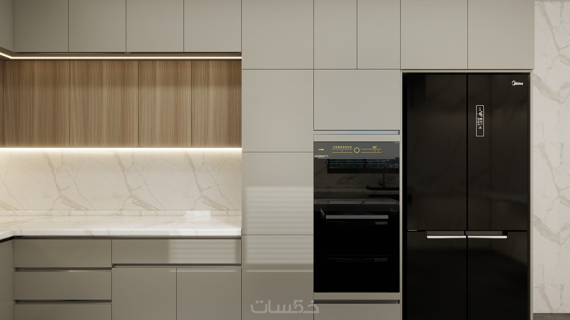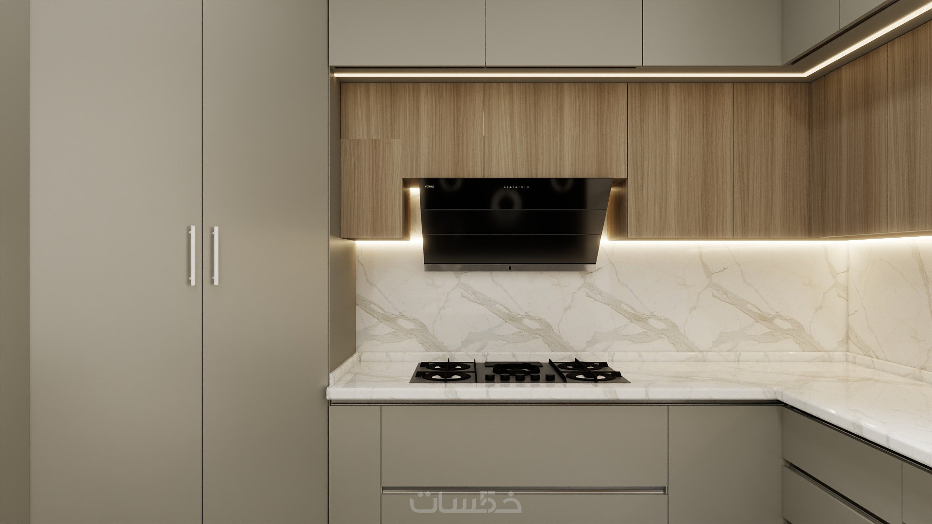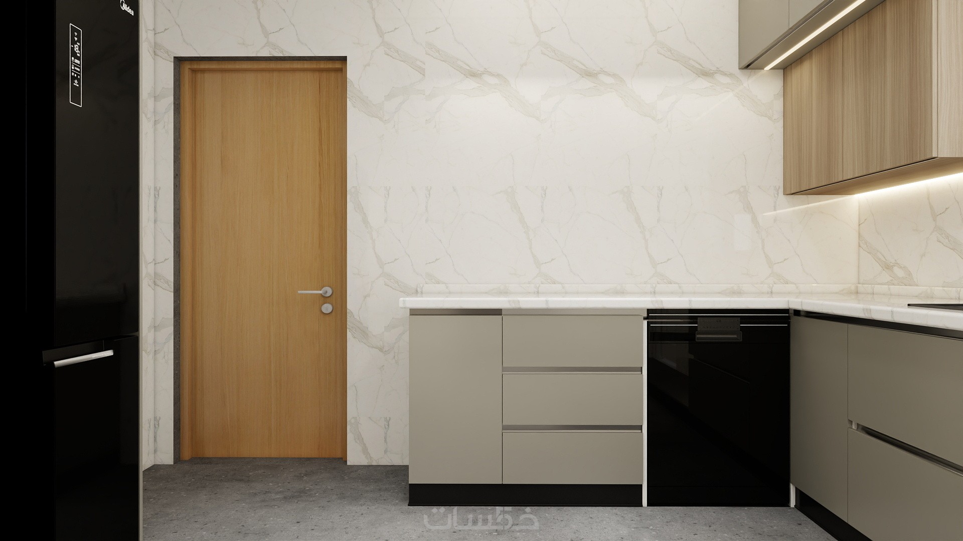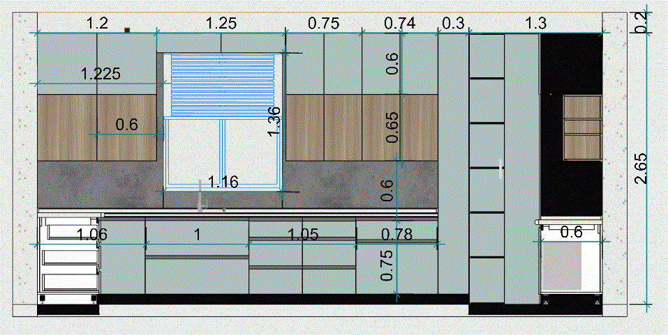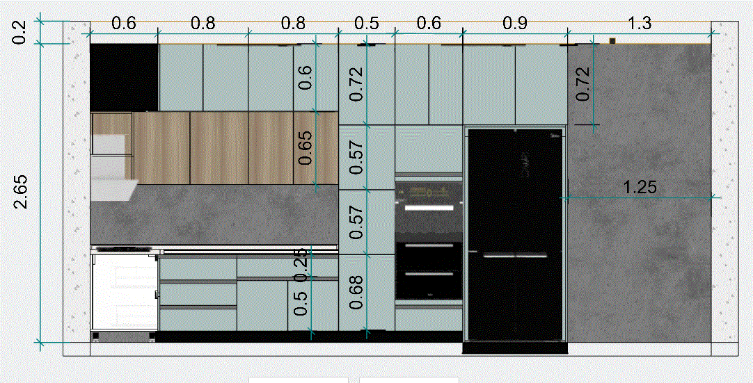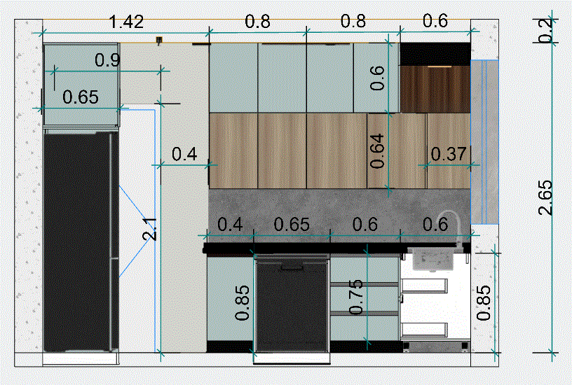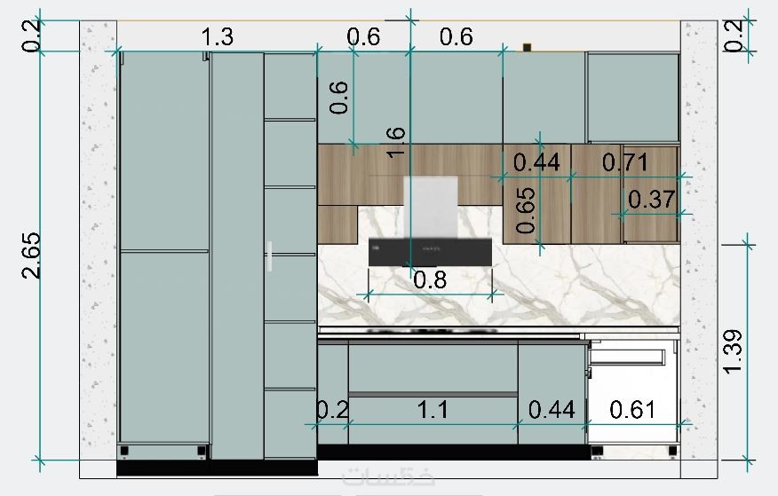 تصميم مطبخ باستايل مودرن بالاضافة للمقاسات التنفيذية بمساحة ابتدائية 5 متر مربع و 3 تعديلات بكشل مجاني