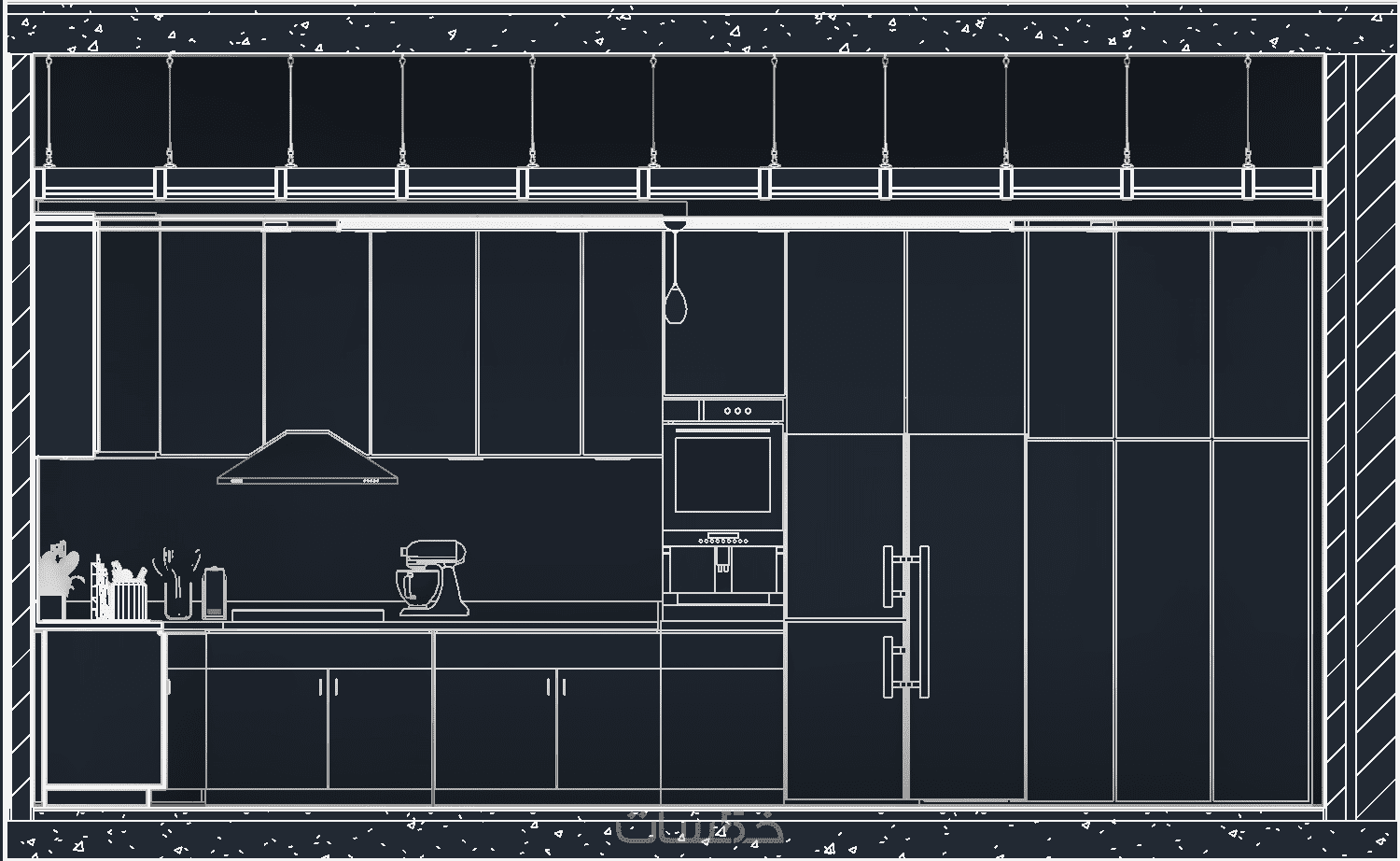 مقطع عرضي (Section): رسم تقني يوضح ارتفاعات الخزائن وتفاصيل السقف المعلق.