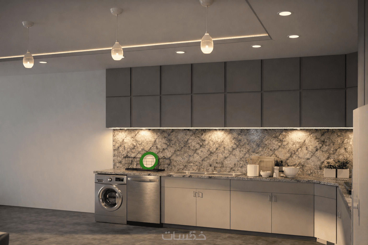 إظهار واقعي (Photorealistic): صور ريندر توضح توزيع الإضاءة والخامات (Marble, Wood, Concrete) بشكل يحاكي الواقع.