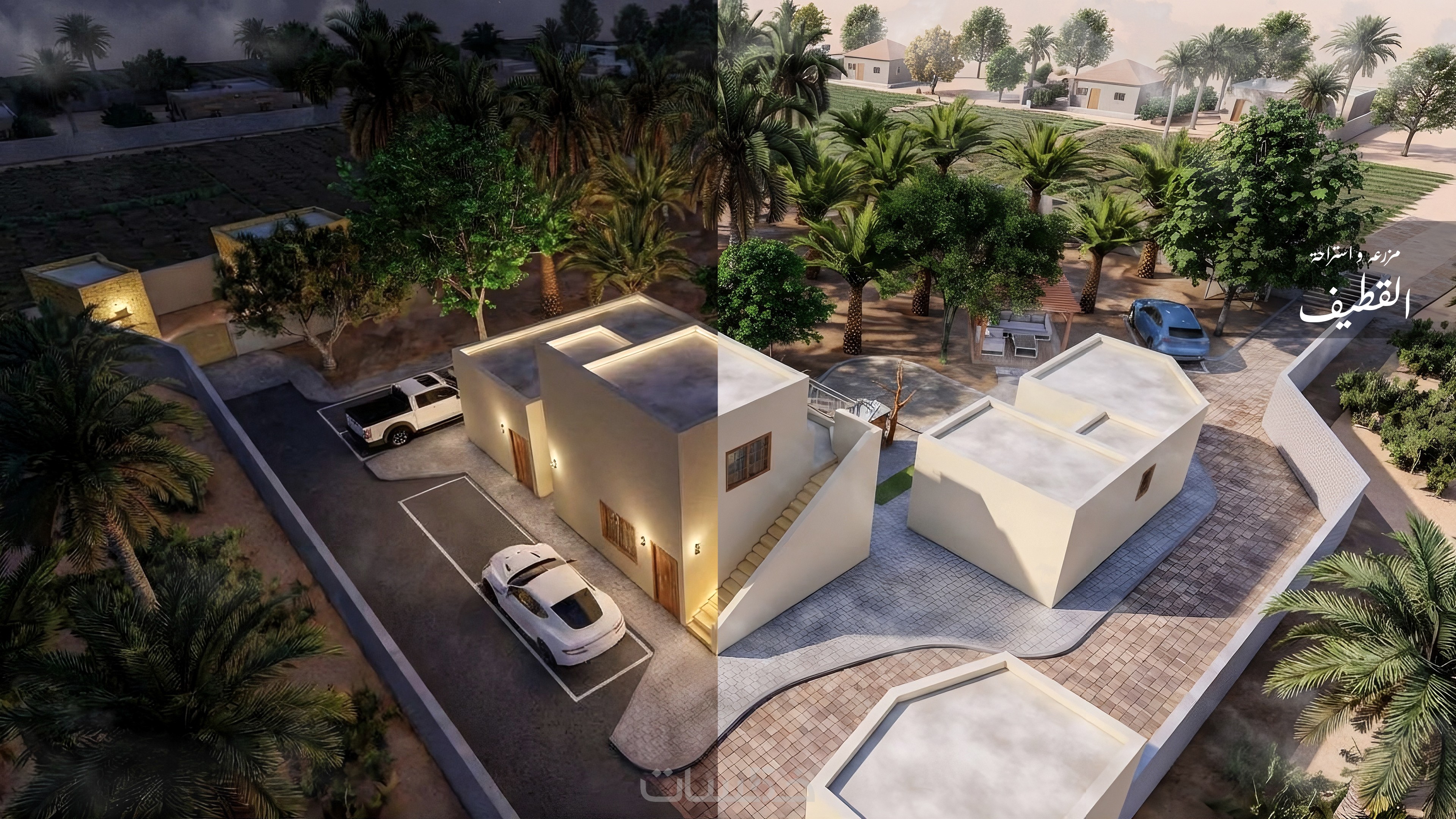 توزيع ذكي للمساحات (جلسات خارجية – مسطحات خضراء – ممرات – حقول زراعية – حظائر – برك/مسبح – مباني) لكل 100 متر مربع