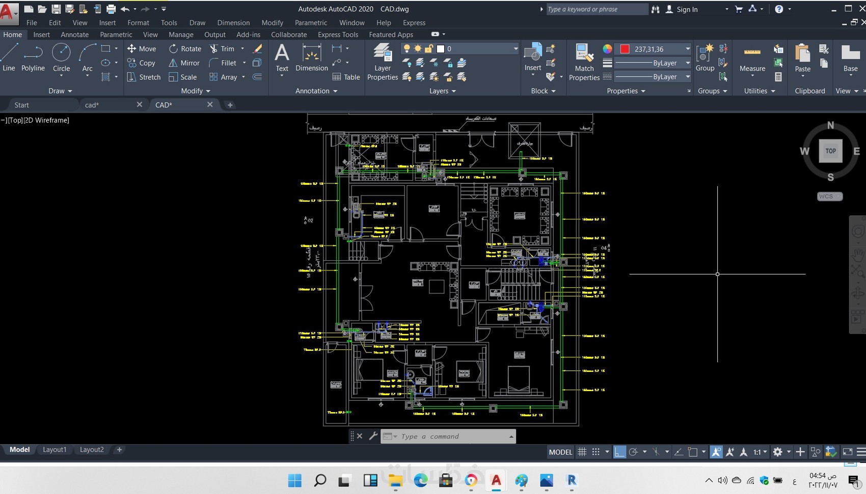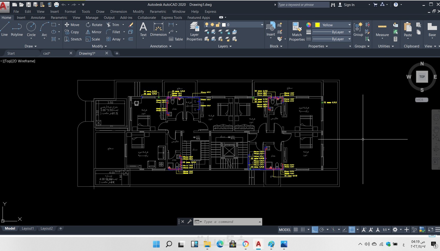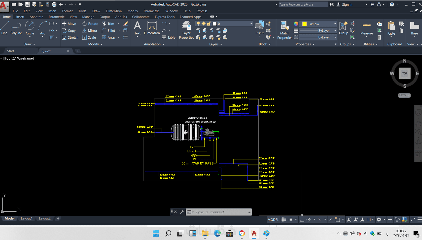 - في تغذية المياه ( رسم شبكات البارد والساخن واماكن السخانات… )