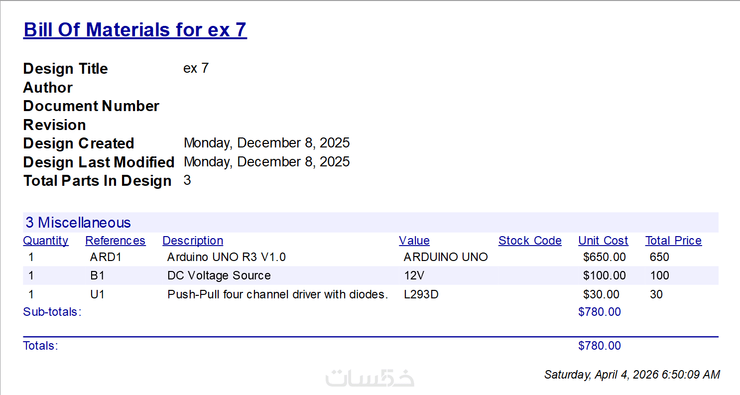 ملف نصي أو Excel يحتوي على أسماء وكميات جميع المكونات الإلكترونية المستخدمة في الدائرة.