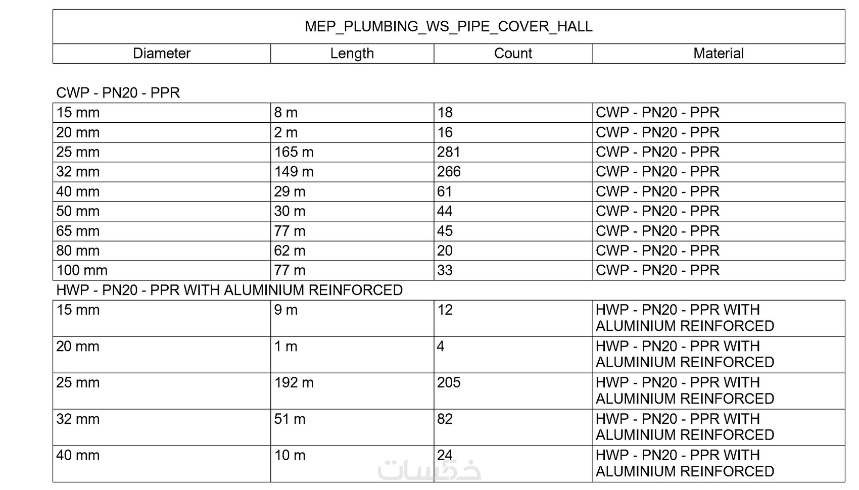 حصر كميات الأنابيب والتجهيزات والأكسسوارات والملحقات لكل نظام