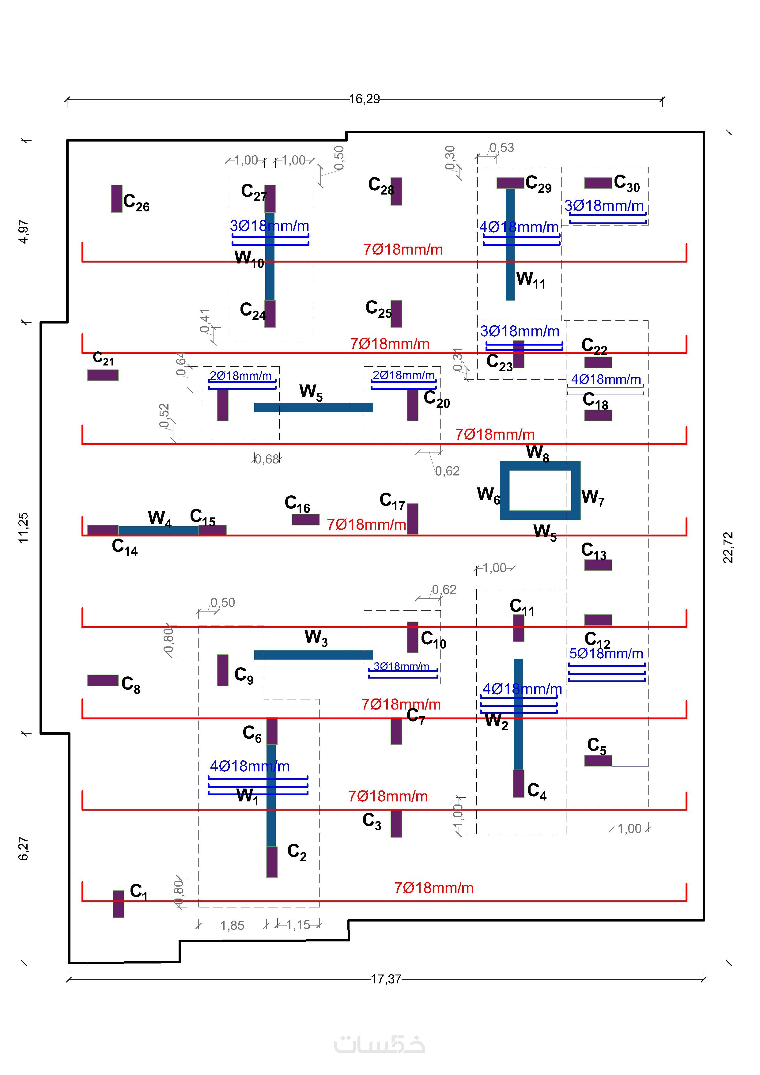 1- تصميم إنشائي كامل لأي منشأ خرساني (بيت – فيلا – مبنى إداري – سكني).